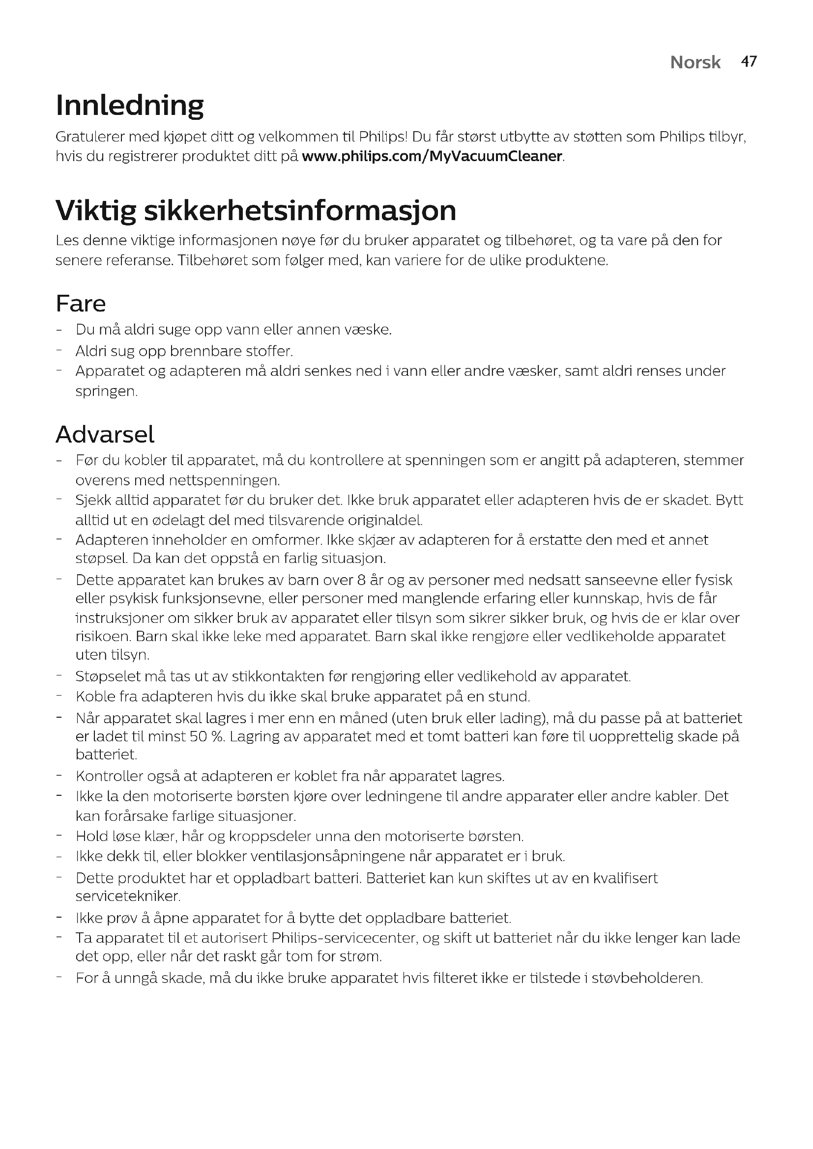 Norsk Innledning Gratulerer med kjøpet ditt og velkommen til Philips! Du får størst utbytte av støtten som Philips tilbyr, hvis du registrerer produktet ditt på www.philips.com/MyVacuumCleaner. Viktig sikkerhetsinformasjon Les denne viktige informasjonen nøye før du bruker apparatet og tilbehøret, og ta vare på den for senere referanse. Tilbehøret som følger med, kan variere for de ulike produktene. Fare