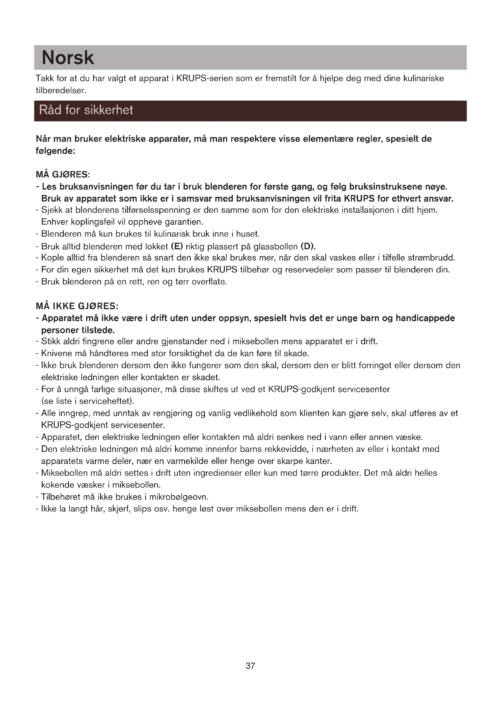 1 eller 2 3 eller 4 5 sek Vari-Pulse 30 sek Vari-Pulse Vari-Pulse Rengöring Om mixern inte fungerar? Återvinning Var rädd om miljön! Din apparat innehåller olika material som kan återanvändas eller återvinnas. Lämna den på en återvinningsstation eller på en auktoriserad serviceverkstad för omhändertagande och behandling. notice* 6/04/06 14:27 Page 3637 Norsk Takk for at du har valgt et apparat i KRUPS-serien som er fremstilt for å hjelpe deg med dine kulinariske tilberedelser. Når man bruker elektriske apparater, må man respektere visse elementære regler, spesielt de følgende: MÅ GJØRES: - Les bruksanvisningen før du tar i bruk blenderen for første gang, og følg bruksinstruksene nøye. Bruk av apparatet som ikke er i samsvar med bruksanvisningen vil frita KRUPS for ethvert ansvar. - Sjekk at blenderens tilførselsspenning er den samme som for den elektriske installasjonen i ditt hjem. Enhver koplingsfeil vil oppheve garantien. - Blenderen må kun brukes til kulinarisk bruk inne i huset. - Bruk alltid blenderen med lokket (E) riktig plassert på glassbollen (D). - Kople alltid fra blenderen så snart den ikke skal brukes mer, når den skal vaskes eller i tilfelle strømbrudd. - For din egen sikkerhet må det kun brukes KRUPS tilbehør og reservedeler som passer til blenderen din. - Bruk blenderen på en rett, ren og tørr overflate. MÅ IKKE GJØRES: - Apparatet må ikke være i drift uten under oppsyn, spesielt hvis det er unge barn og handicappede personer tilstede. - Stikk aldri fingrene eller andre gjenstander ned i miksebollen mens apparatet er i drift. - Knivene må håndteres med stor forsiktighet da de kan føre til skade. - Ikke bruk blenderen dersom den ikke fungerer som den skal, dersom den er blitt forringet eller dersom den elektriske ledningen eller kontakten er skadet. - For å unngå farlige situasjoner, må disse skiftes ut ved et KRUPS-godkjent servicesenter (se liste i serviceheftet). - Alle inngrep, med unntak av rengjøring og vanlig vedlikehold som klienten kan gjøre selv, skal utføres av et KRUPS-godkjent servicesenter. - Apparatet, den elektriske ledningen eller kontakten må aldri senkes ned i vann eller annen væske. - Den elektriske ledningen må aldri komme innenfor barns rekkevidde, i nærheten av eller i kontakt med apparatets varme deler, nær en varmekilde eller henge over skarpe kanter. - Miksebollen må aldri settes i drift uten ingredienser eller kun med tørre produkter. Det må aldri helles kokende væsker i miksebollen. - Tilbehøret må ikke brukes i mikrobølgeovn. - Ikke la langt hår, skjerf, slips osv. henge løst over miksebollen mens den er i drift. Råd for sikkerhet notice* 6/04/06 14:27 Page 3738 A Metallbase B Panel for hastighetsvalg b1 – stopptast b2 –Slow-tast (sakte hastighet) b3 – hastighet 1 b4 – hastighet 2 b5 – hastighet 3 b6 – hastighet 4 b7 –Ice Crush-funksjon (isknusing) b8 –Vari-Pulse-funksjon C Rom for oppbevaring av ledningen D Miksebolleenhet d1 Låsesokkel d2 Avtakbar knivholder d3 Tetningsring d4 Gradert glassbeholder på 1,75 l E Lokk til miksebolle F Doseringsbeger på 75 ml G Hakketilbehør (tilgjengelig ved godkjente service-sentra) Viktig: Forsikre deg om at blenderlokket (E) med doseringbeger (F) er riktig plassert på miksebollen (D). - Start aldri apparatet på den høyeste hastigheten. - Hastigheten må kun økes progressivt. - Vent til apparatet er helt stanset før du tar av miksebollen eller tilbehøret. - For en mer behagelig bruk eller under oppbevaring, kan du redusere lengden på den elektriske ledningen ved å skyve den inn i metallbasen (A) gjennom åpningen (C) på baksiden av apparatet (figur 1). - Før apparatet tas i bruk for første gang, må miksebollen, lokket, doseringsbegeret og hakketilbehøret rengjøres i lunkent såpevann. Skyll, og tørk deretter delene godt.