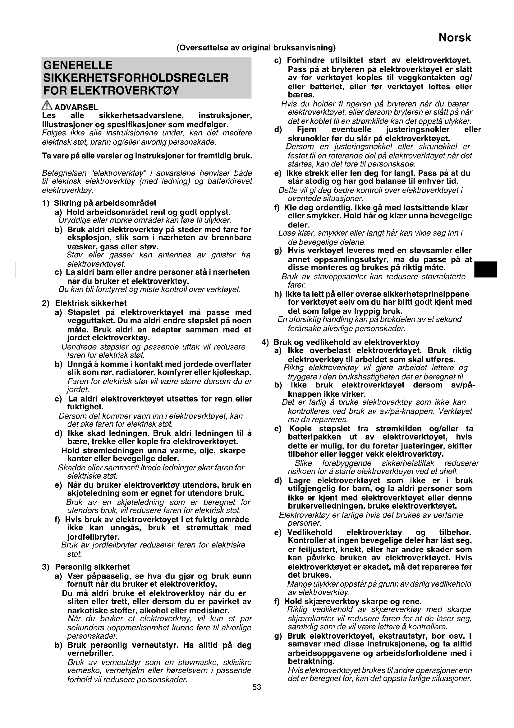 a) Ikke overbelast elektroverktøyet. Bruk riktig elektroverktøy til arbeidet som skal utføres. Riktig elektroverktøy vil gjøre arbeidet lettere og tryggere i den brukshastigheten det er beregnet til. b) Ikke bruk elektroverktøyet dersom av/på- knappen ikke virker. Det er farlig å bruke elektroverktøy som ikke kan kontrolleres ved bruk av av/på-knappen. Verktøyet må da repareres. c) Kople støpslet fra strømkilden og/eller ta batteripakken ut av elektroverktøyet, hvis dette er mulig, før du foretar justeringer, skifter tilbehør eller legger vekk elektroverktøy. Slike forebyggende sikkerhetstiltak reduserer risikoen for å starte elektroverktøyet ved et uhell. d) Lagre elektroverktøyet som ikke er i bruk utilgjengelig for barn, og la aldri personer som ikke er kjent med elektroverktøyet eller denne brukerveiledningen, bruke elektroverktøyet. Elektroverktøy er farlige hvis det brukes av uerfarne personer. e) Vedlikehold elektroverktøy og tilbehør. Kontroller at ingen bevegelige deler har låst seg, er feiljustert, knekt, eller har andre skader som kan påvirke bruken av elektroverktøyet. Hvis elektroverktøyet er skadet, må det repareres før det brukes. Mange ulykker oppstår på grunn av dårlig vedlikehold av elektroverktøy. f) Hold skjæreverktøy skarpe og rene. Riktig vedlikehold av skjæreverktøy med skarpe skjærekanter vil redusere faren for at de låser seg, samtidig som de vil være lettere å kontrollere. g) Bruk elektroverktøyet, ekstrautstyr, bor osv. i samsvar med disse instruksjonene, og ta alltid arbeidsoppgavene og arbeidsforholdene med i betraktning. Hvis elektroverktøyet brukes til andre operasjoner enn det er beregnet for, kan det oppstå farlige situasjoner. GENERELLE SIKKERHETSFORHOLDSREGLER