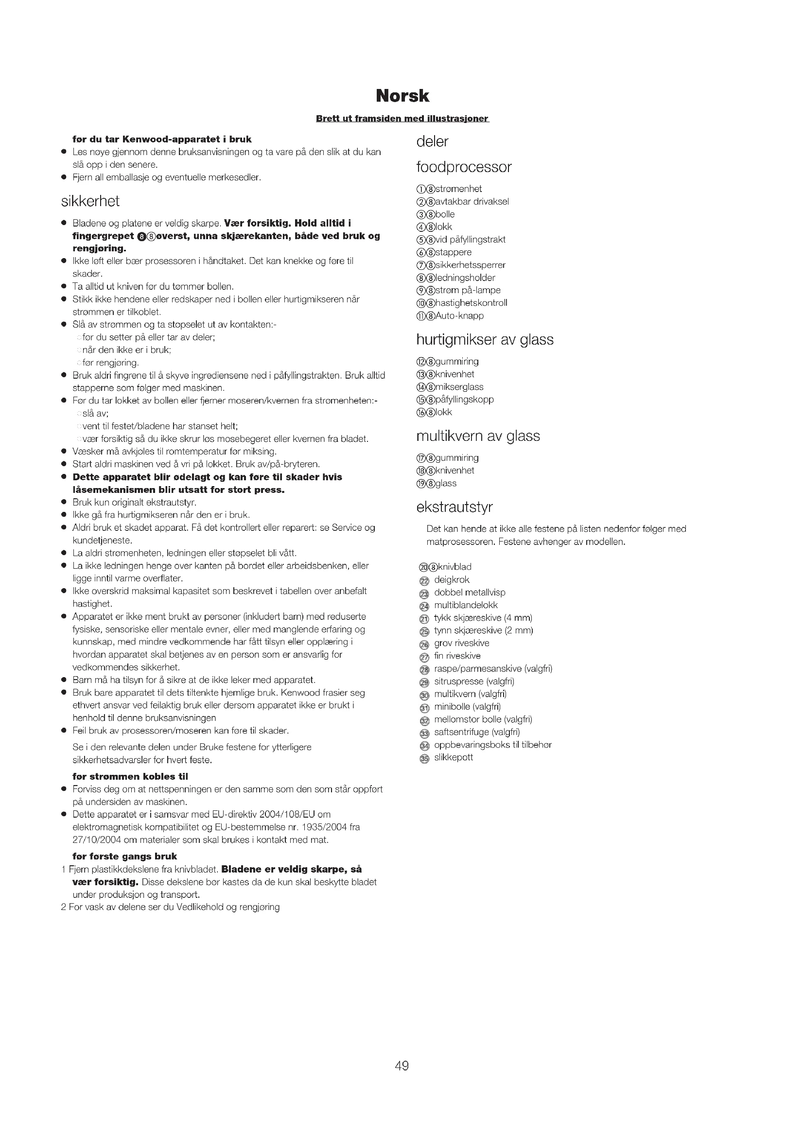 Dette apparatet er i samsvar med EU-direktiv 2004/108/EU om elektromagnetisk kompatibilitet og EU-bestemmelse nr. 1935/2004 fra 27/10/2004 om materialer som skal brukes i kontakt med mat. før første gangs bruk 1 Fjern plastikkdekslene fra knivbladet. Bladene er veldig skarpe, så vær forsiktig. Disse dekslene bør kastes da de kun skal beskytte bladet under produksjon og transport. 2 For vask av delene ser du Vedlikehold og rengjøring deler foodprocessor strømenhet avtakbar drivaksel bolle lokk vid påfyllingstrakt stappere sikkerhetssperrer ledningsholder ! strøm på-lampe " hastighetskontroll # Auto-knapp hurtigmikser av glass $ gummiring % knivenhet & mikserglass ' påfyllingskopp ( lokk multikvern av glass ) gummiring