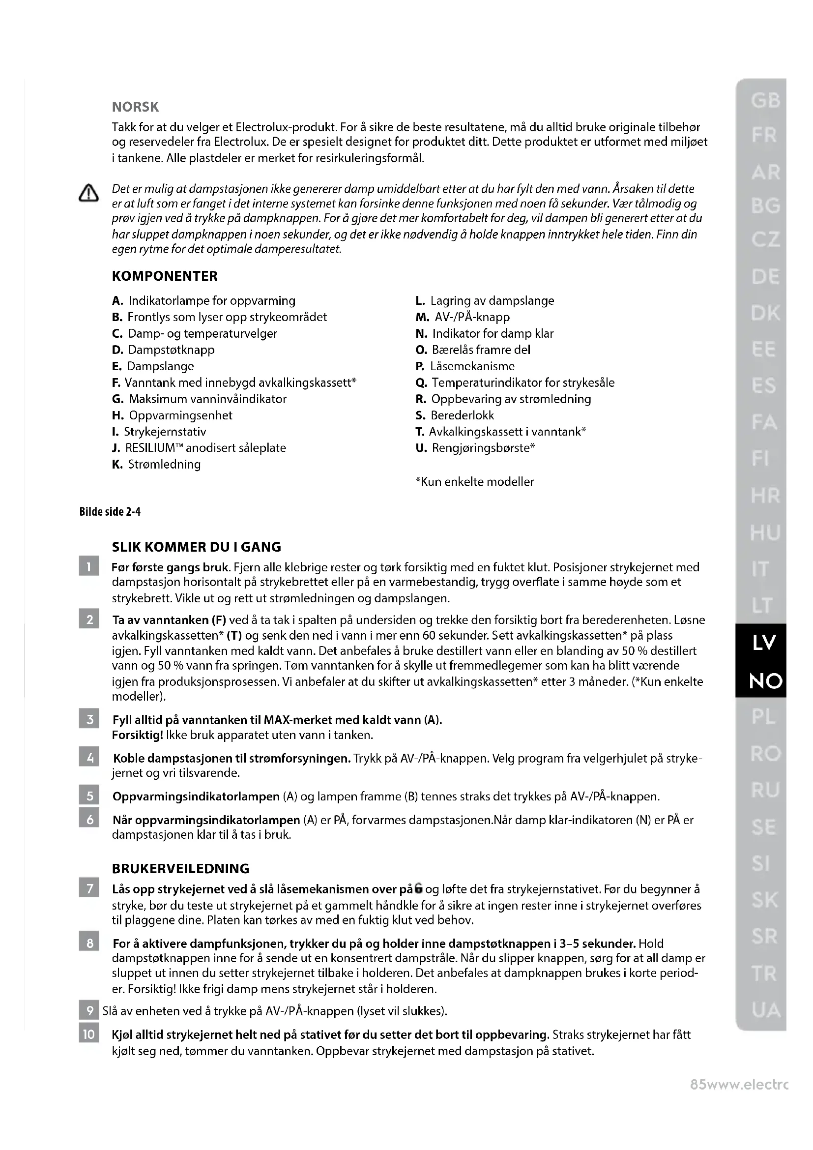1 Før første gangs bruk. Fjern alle klebrige rester og tørk forsiktig med en fuktet klut. Posisjoner strykejernet med dampstasjon horisontalt på strykebrettet eller på en varmebestandig, trygg overate i samme høyde som et strykebrett. Vikle ut og rett ut strømledningen og dampslangen. 2 Ta av vanntanken (F) ved å ta tak i spalten på undersiden og trekke den forsiktig bort fra berederenheten. Løsne avkalkingskassetten*(T) og senk den ned i vann i mer enn 60 sekunder. Sett avkalkingskassetten*på plass igjen. Fyll vanntanken med kaldt vann. Det anbefales å bruke destillert vann eller en blanding av 50 % destillert vann og 50 % vann fra springen. Tøm vanntanken for å skylle ut fremmedlegemer som kan ha blitt værende igjen fra produksjonsprosessen. Vi anbefaler at du skifter ut avkalkingskassetten* etter 3 måneder. (*Kun enkelte modeller). 3 Fyll alltid på vanntanken til MAX-merket med kaldt vann (A). Forsiktig! Ikke bruk apparatet uten vann i tanken. 4 Koble dampstasjonen til strømforsyningen. Trykk på AV-/PÅ-knappen. Velg program fra velgerhjulet på stryke- jernet og vri tilsvarende. 5 Oppvarmingsindikatorlampen (A) og lampen framme (B) tennes straks det trykkes på AV-/PÅ-knappen. 6 Når oppvarmingsindikatorlampen (A) er PÅ, forvarmes dampstasjonen.Når damp klar-indikatoren (N) er PÅ er dampstasjonen klar til å tas i bruk. BRUKERVEILEDNING 7 Lås opp strykejernet ved å slå låsemekanismen over på og løfte det fra strykejernstativet. Før du begynner å stryke, bør du teste ut strykejernet på et gammelt håndkle for å sikre at ingen rester inne i strykejernet overføres til plaggene dine. Platen kan tørkes av med en fuktig klut ved behov. 8 For å aktivere dampfunksjonen, trykker du på og holder inne dampstøtknappen i 3–5 sekunder. Hold dampstøtknappen inne for å sende ut en konsentrert dampstråle. Når du slipper knappen, sørg for at all damp er sluppet ut innen du setter strykejernet tilbake i holderen. Det anbefales at dampknappen brukes i korte period- er. Forsiktig! Ikke frigi damp mens strykejernet står i holderen. 9 Slå av enheten ved å trykke på AV-/PÅ-knappen (lyset vil slukkes). 10 Kjøl alltid strykejernet helt ned på stativet før du setter det bort til oppbevaring. Straks strykejernet har fått kjølt seg ned, tømmer du vanntanken. Oppbevar strykejernet med dampstasjon på stativet.86 www.electrolux.com 11 Når du er ferdig med å bruke enheten, slår du den av ved å trykke på AV-/PÅ-knappen. Plasser strykejernet på strykejernstativet og slå låsemekanismen over på for å sikre strykejernet. 12 Oppbevar bestandig strømledningen i lagringsrommet til strømledning (R) og dampslangen i lagringsrom- met til dampslange (L) i sokkelen av dampstasjonen. Advarsel! Vikle ALDRI strømledningen rundt strykejernet. RENGJØRING 13 Vri stasjonens sokkel til side, slik at berederlokket havner øverst. Skru av berederlokket. Snu enheten på siden i en vask og tøm berederen helt. 14 Bland avkalkingsmiddel og vann med det spesiserte blandingsforholdet, og lag en avkalkingsblanding på minst 300ml. (Bruk anbefalt forhold for blandingen. Hvis det er store mengder avsetninger, må du øke mengden avkalkingsmiddel riktig.) Merk: Vi anbefaler at du bruker avkalkingsmiddelet EUD5 fra Electrolux. Følg instruksjonene på asken for riktig forhold mellom vann og avkalkningsmiddel. Vi anbefaler at produktet rengjøres annen hver måned. 15 Hell ut blandingen. Fyll oppvarmingsenheten med rent vann, som du deretter heller ut. Gjenta dette trinnet ere ganger til avsetningene er ernet, og det ikke lenger kjennes lukt etter avkalkingsmiddel. Hell en måleskje med rent vann i oppvarmingsenheten før du setter alt sammen igjen. GARANTIEN DEKKER IKKE SKADE SOM SKYLDES BLOKKERINGER PÅ GRUNN AV KALK. Etter rengjøringen skal ikke kokeren være helt tom, men det skal være litt vann igjen i den (før den lukkes igjen). 16 Sett rengjøringsbørsten* inn i berederen mens du åpner og gjør rent for vann- og kalkrester idet du holder enheten over vasken. (*Kun enkelte modeller). 17 Gjør produktet rent med en myk, fuktig klut. For å erne stridige ekker, kan du bruke en liten mengde ikke-slipende rengjøringsmiddel. Nyt ditt nye Electrolux-produkt! SIKKERHETSRÅD Les følgende anvisninger nøye før du bruker maskinen for første gang.