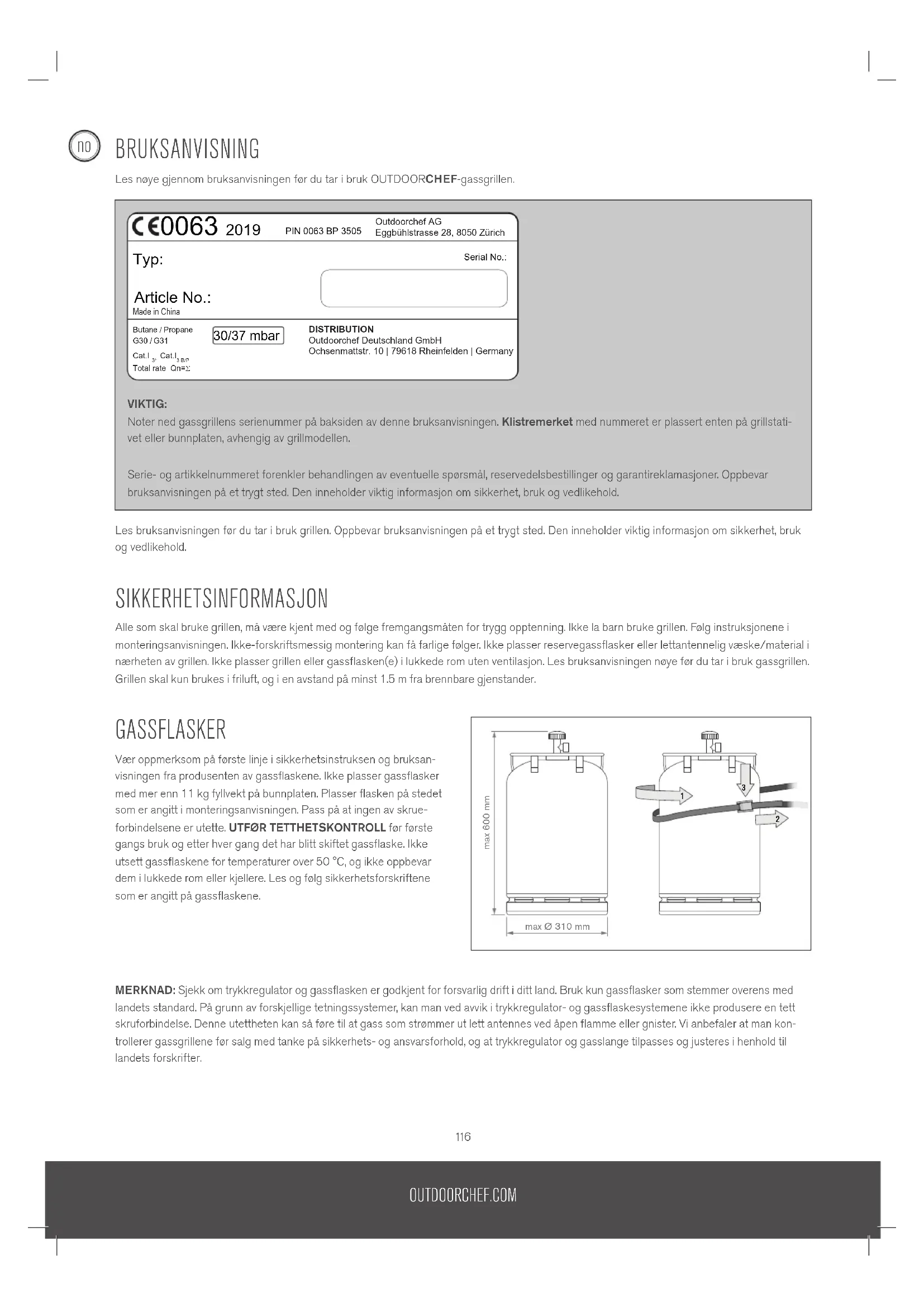 BRUKSANVISNING Les nøye gjennom bruksanvisningen før du tar i bruk OUTDOORCHEF-gassgrillen. Les bruksanvisningen før du tar i bruk grillen. Oppbevar bruksanvisningen på et trygt sted. Den inneholder viktig informasjon om sikkerhet, bruk og vedlikehold. SIKKERHETSINFORMASJON Alle som skal bruke grillen, må være kjent med og følge fremgangsmåten for trygg opptenning. Ikke la barn bruke grillen. Følg instruksjonene i monteringsanvisningen. Ikke-forskriftsmessig montering kan få farlige følger. Ikke plasser reservegassflasker eller lettantennelig væske/material i nærheten av grillen. Ikke plasser grillen eller gassflasken(e) i lukkede rom uten ventilasjon. Les bruksanvisningen nøye før du tar i bruk gassgrillen. Grillen skal kun brukes i friluft, og i en avstand på minst 1.5 m fra brennbare gjenstander. GASSFLASKER Vær oppmerksom på første linje i sikkerhetsinstruksen og bruksan-visningen fra produsenten av gassflaskene. Ikke plasser gassflasker med mer enn 11 kg fyllvekt på bunnplaten. Plasser flasken på stedet som er angitt i monteringsanvisningen. Pass på at ingen av skrue-forbindelsene er utette. UTFØR TETTHETSKONTROLL før første gangs bruk og etter hver gang det har blitt skiftet gassflaske. Ikke utsett gassflaskene for temperaturer over 50°C, og ikke oppbevar dem i lukkede rom eller kjellere. Les og følg sikkerhetsforskriftene som er angitt på gassflaskene. MERKNAD: Sjekk om trykkregulator og gassflasken er godkjent for forsvarlig drift i ditt land. Bruk kun gassflasker som stemmer overens med landets standard. På grunn av forskjellige tetningssystemer, kan man ved avvik i trykkregulator- og gassflaskesystemene ikke produsere en tett skruforbindelse. Denne utettheten kan så føre til at gass som strømmer ut lett antennes ved åpen flamme eller gnister. Vi anbefaler at man kon- trollerer gassgrillene før salg med tanke på sikkerhets- og ansvarsforhold, og at trykkregulator og gasslange tilpasses og justeres i henhold til landets forskrifter.VIKTIG: Noter ned gassgrillens serienummer på baksiden av denne bruksanvisningen. Klistremerket med nummeret er plassert enten på grillstati- vet eller bunnplaten, avhengig av grillmodellen. Serie- og artikkelnummeret forenkler behandlingen av eventuelle spørsmål, reservedelsbestillinger og garantireklamasjoner. Oppbevar bruksanvisningen på et trygt sted. Den inneholder viktig informasjon om sikkerhet, bruk og vedlikehold.max 600 mmmax Ø 310 mm