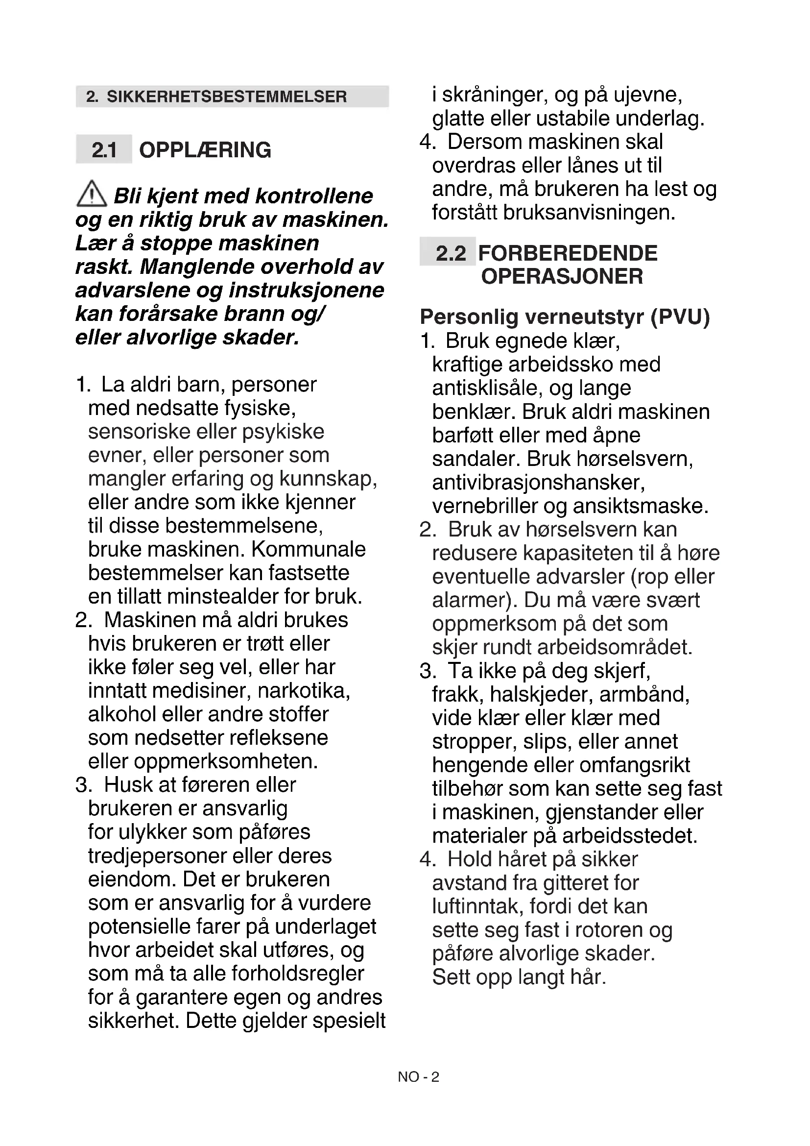 kraftige arbeidssko med antisklisåle, og lange benklær. Bruk aldri maskinen barføtt eller med åpne sandaler. Bruk hørselsvern, antivibrasjonshansker, vernebriller og ansiktsmaske.