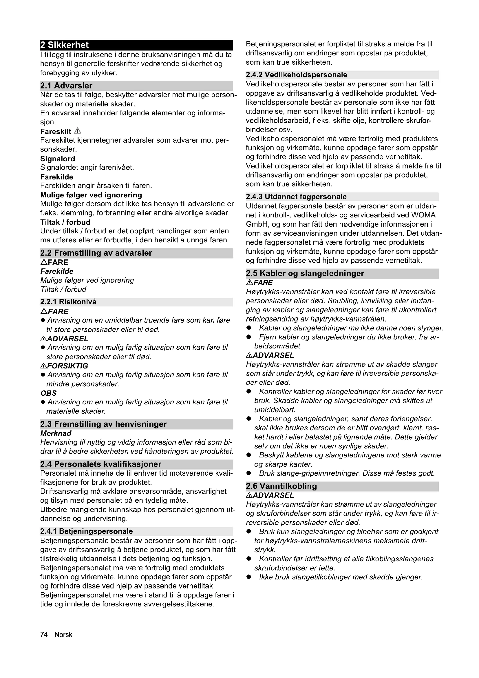Sikkerhetsinnretningene skal beskytte betjeningspersona- let og må ikke endres eller sløyfes. Produktet er utstyrt med en avtrekkersikring, som forhin- drer at avtrekkeren utløses av vanvare. Aldri lås fast avtrekkeren. Ikke blokker eller endre avtrekkersikringen. 3 Forskriftsmessig bruk Produktet brukes til betjening av håndholdte sprayenheter fra WOMA GmbH, som brukes med et tillatt driftstrykk på 1100 bar. I kombinasjon med en høytrykks-vannstrålemaskin, et strålerør/lanserør og et vannverktøy brukes produktet til å rette væske som står under trykk, målrettet mot en overfla- te, og muliggjør dermed sliping, rengjøring osv. av ulike overflater og materialer, som f.eks. stål, betong osv. Dette kan gjøres med ulike vannverktøy fra WOMA GmbH. Produktet skal kun driftes med vann som samsvarer med WOMAs retningslinje for vannkvalitet (se kapittel 12.1 Ret- ningslinje for vannkvalitet). Den maksimalt tillatte volum- strømmen for væsken er 45 l/min. Før bruk må du kontrollere produktets sikkerhetsinnretnin- ger (se kapittel 6 Igangsetting). Med forskriftsmessig bruk menes også bruk av kun origi- nale reservedeler fra WOMA GmbH. En annen bruk enn den som er fastlagt under forskrifts- messig bruk eller bruk som går ut over dette, regnes for å være ikke forskriftsmessig. Ta hensyn til sikkerhetshenvisningene og advarslene.