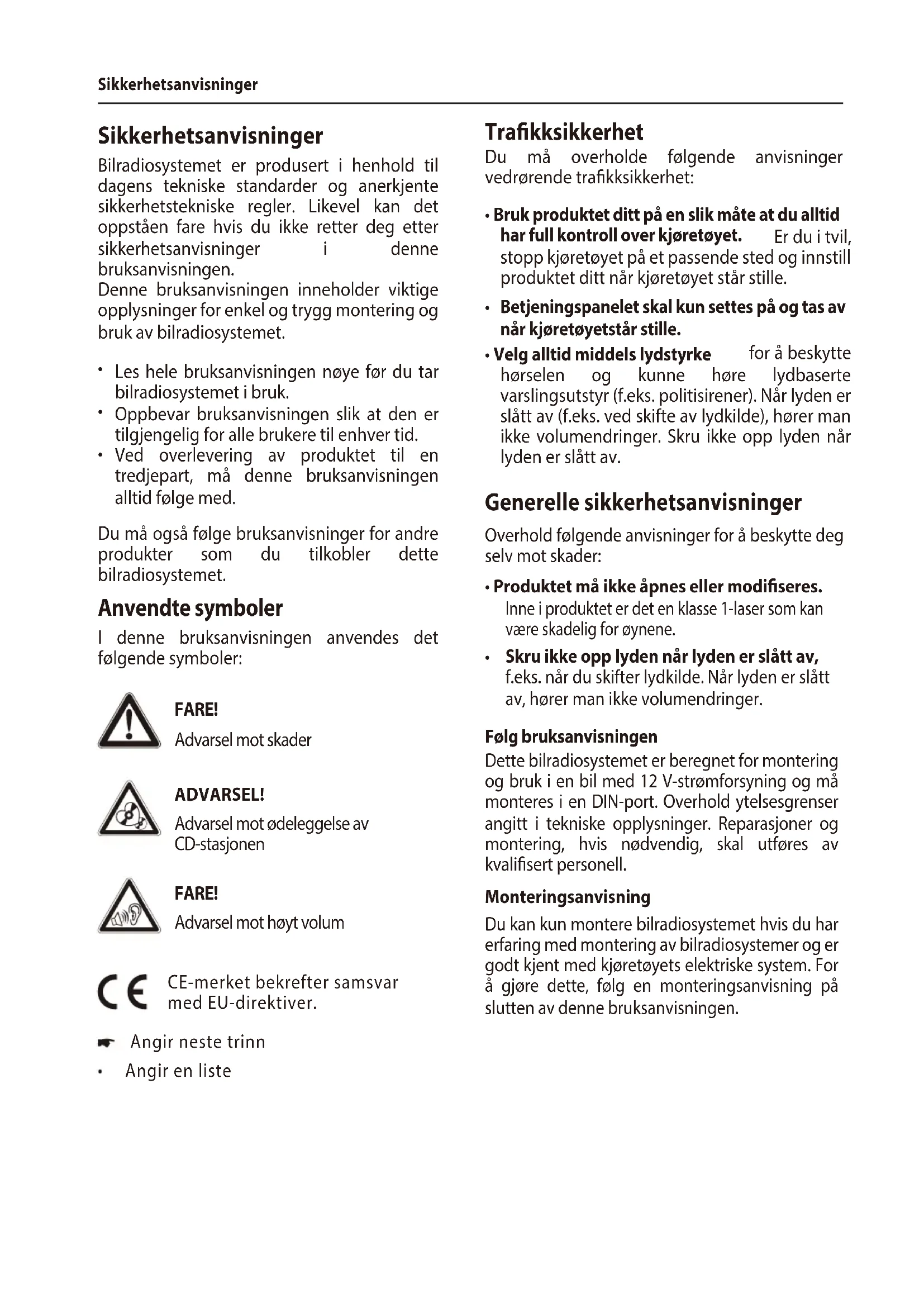 -knapp (Eject) Skyve ut CD -knapp Avslutt/avvis et anrop -knapp Kort trykk: Motta et anrop, hurtigoppringing Langt trykk: Åpne mobilens telefonbok eller slå på taleoppringning Taster 1 - 5 IR-mottaker SRC -knappen Velge minnebank eller lydkilde DIS -knappen Kort trykk: Skifte visning Langt trykk: Justere lysstyrken på skjermenSikkerhetsanvisninger Anvendte symboler FARE! Advarsel mot skader ADVARSEL! Advarsel mot ødeleggelse av CD-stasjonen FARE! Advarsel mot høyt volum CE-merket bekrefter samsvar med EU-direktiver. Angir neste trinn Angir en liste Trakksikkerhet