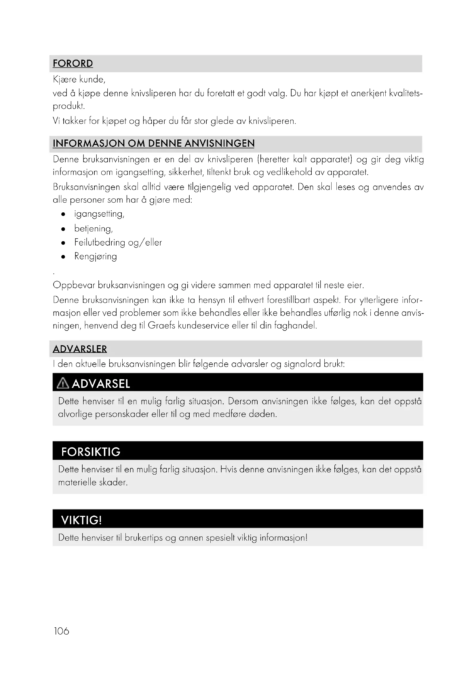 Oppbevar bruksanvisningen og gi videre sammen med apparatet til neste eier. Denne bruksanvisningen kan ikke ta hensyn til ethvert forestillbart aspekt. For ytterligere infor- masjon eller ved problemer som ikke behandles eller ikke behandles utførlig nok i denne anvis- ningen, henvend deg til Graefs kundeservice eller til din faghandel. ADVARSLER I den aktuelle bruksanvisningen blir følgende advarsler og signalord brukt: ADVARSEL Dette henviser til en mulig farlig situasjon. Dersom anvisningen ikke følges, kan det oppstå alvorlige personskader eller til og med medføre døden. FORSIKTIG Dette henviser til en mulig farlig situasjon. Hvis denne anvisningen ikke følges, kan det oppstå materielle skader. VIKTIG! Dette henviser til brukertips og annen spesielt viktig informasjon!107