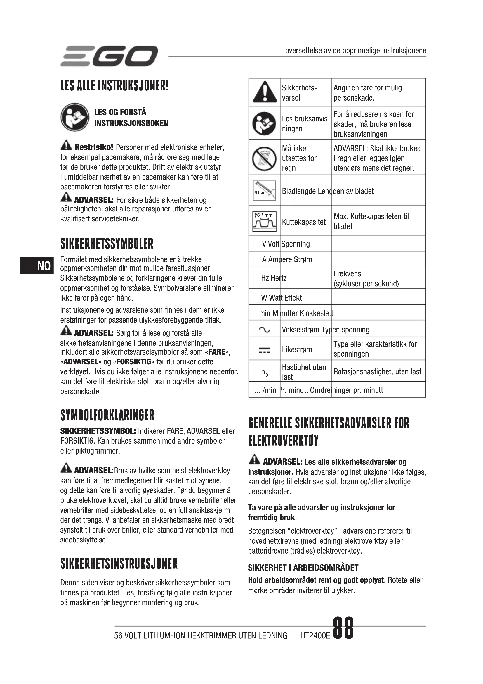 ◾ Hold alle deler av kroppen borte fra kutterbladet. Ikke fjern avkuttet materiale eller hold materialet som skal kuttes når bladene er i bevegelse. Kontroller at bryteren er slått av når du fjerner fastkjørt materiale. Et øyeblikks uoppmerksomhet ved bruk av hekksaksen kan føre til alvorlig personskade. ◾ Bær hekksaksen i håndtaket, med kutterbladet stoppet. Ved transport eller lagring av hekksaksen, skal dekselet alltid settes på kutterenheten. Riktig håndtering av hekksaksen vil redusere mulig personskade fra kutterblader. ◾ Elektroverktøyet skal bare holdes i de isolerte gripeatene, fordi kniven kan komme i kontakt med skjult kabling. Kutterblader som kommer i kontakt med en strømsatt ledning kan gjøre synlige metalldeler av elektroverktøyet strømførende, og gi operatøren elektrisk støt. ◾ Hold kabelen unna kutteområdet. Under drift kan kabelen være skjult i busker, og skjæres av et blad ved et uhell. ◾ Sjekk om det nnes fremmedlegemer i hekken før du begynner, f.eks. ståltrådgjerder. ◾ Bruk bare hekksaksen når skjermen er riktig montert. Bruk av hekksaksen uten riktig skjerm kan føre til alvorlige personskader! ◾ Bruk begge hender når du bruker hekksaksen. Bruk med én hånd kan føre til tap av kontroll og alvorlige personskader. ADVARSEL: Sjekk om det nnes fremmedlegemer i hekken før du begynner, f.eks. ståltrådgjerder. Bruk bare hekksaksen når skjermen er riktig montert. Bruk av hekksaksen uten riktig skjerm kan føre til alvorlige personskader! VIKTIGE SIKKERHETSINSTRUKSJONER ◾ Ikke bruk batteridrevet hekksaks i regnvær. ◾ Ikke lad batteriet i regn eller på våte steder. ◾ Bruk kun med batteripakker og ladere som oppført i g. A ◾ Ikke ta tak i eksponerte kutterblader eller kutterkanter når du plukker opp eller holder hekksaksen. ◾ Skal ikke brukes på stige, tak, i trær eller en andre ustabile steder. Stabilt fotfeste på et fast underlag muliggjør bedre styring av hekksaksen i uventede situasjoner. ◾ La aldri barn bruke hekksaksen. ◾ Sikkerhetsutstyr skal aldri fjernes eller tukles med. Sjekk regelmessig at driften er riktig. Aldri gjøre noe for å forstyrre den tiltenkte funksjonen til en sikkerhetsanordning, eller for å redusere beskyttelsen som en sikkerhetsanordning gir. ◾ Bruk aldri snøfreseren uten skikkelig beskyttelse, plater eller annet sikkerhetsutstyr på plass. ◾ Sjekk etter skadede deler før videre bruk av hekksaksen. Skjermer eller andre skadede deler undersøkes nøye for å fastslå om de vil fungere riktig og oppfylle den tiltenkte funksjonen sin. Sjekk justeringen av bevegelige deler, etter oppbinding av bevegelige deler, deler som er ødelagt, montering og eventuelle andre forhold som kan påvirke driften. Skjermer eller andre ødelagte deler må repareres forsvarlig eller skiftes ut av et autorisert servicesenter dersom ikke annet er angitt andre steder i denne håndboken. ◾ Sjekk bladet og motorfesteboltene ofte, for å se at de er riktig strammet. Blader skal også inspiseres visuelt blad for skader (f.eks, bøying, sprekker og slitasje). Bladet skal bare byttes med et blad fra EGO