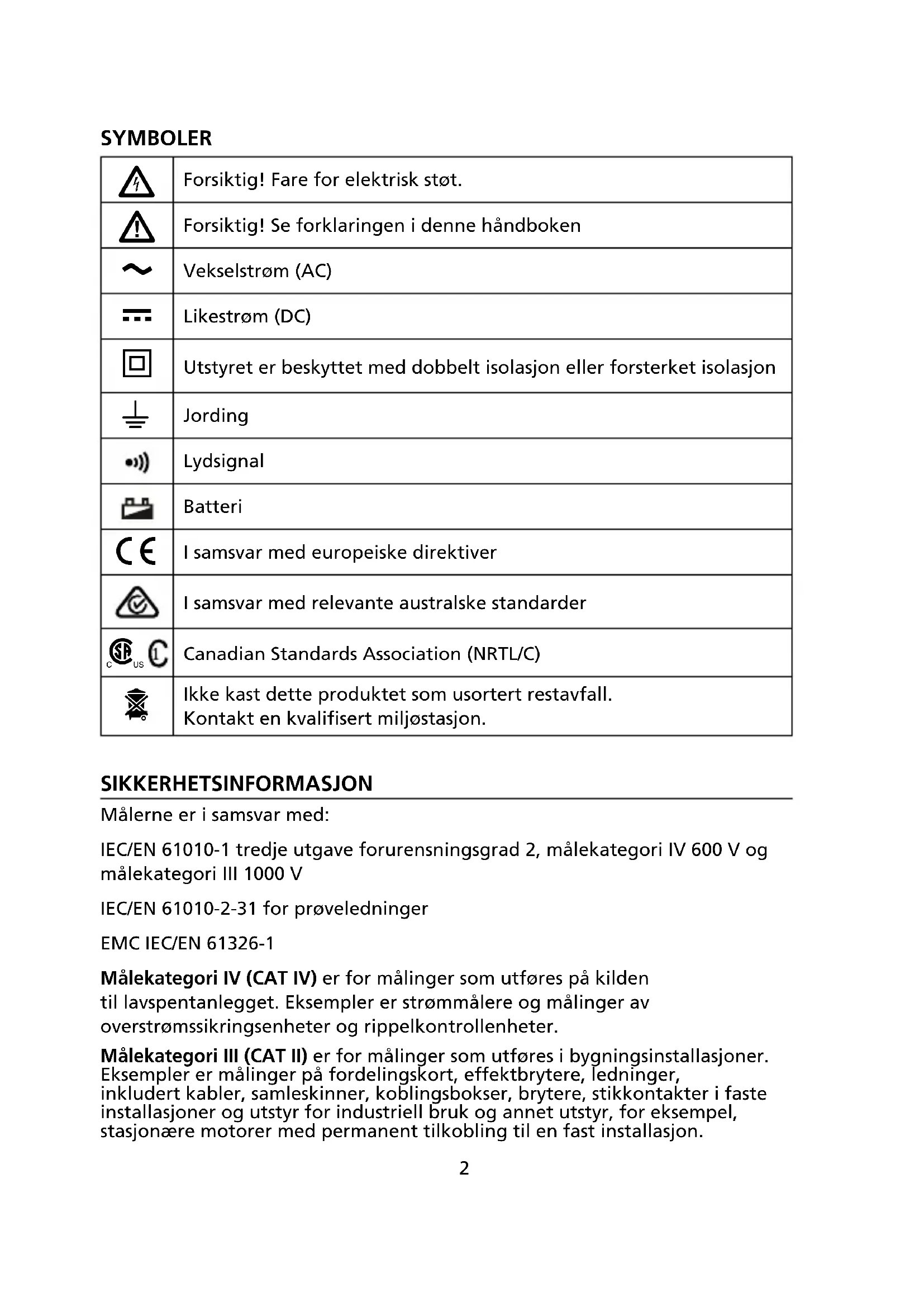 Målekategori IV (CAT IV) er for målinger som utføres på kilden til lavspentanlegget. Eksempler er strømmålere og målinger av overstrømssikringsenheter og rippelkontrollenheter. Målekategori III (CAT II) er for målinger som utføres i bygningsinstallasjoner. Eksempler er målinger på fordelingskort, effektbrytere, ledninger, inkludert kabler, samleskinner, koblingsbokser, brytere, stikkontakter i faste installasjoner og utstyr for industriell bruk og annet utstyr, for eksempel, stasjonære motorer med permanent tilkobling til en fast installasjon.3 XADVARSEL: Les før bruk