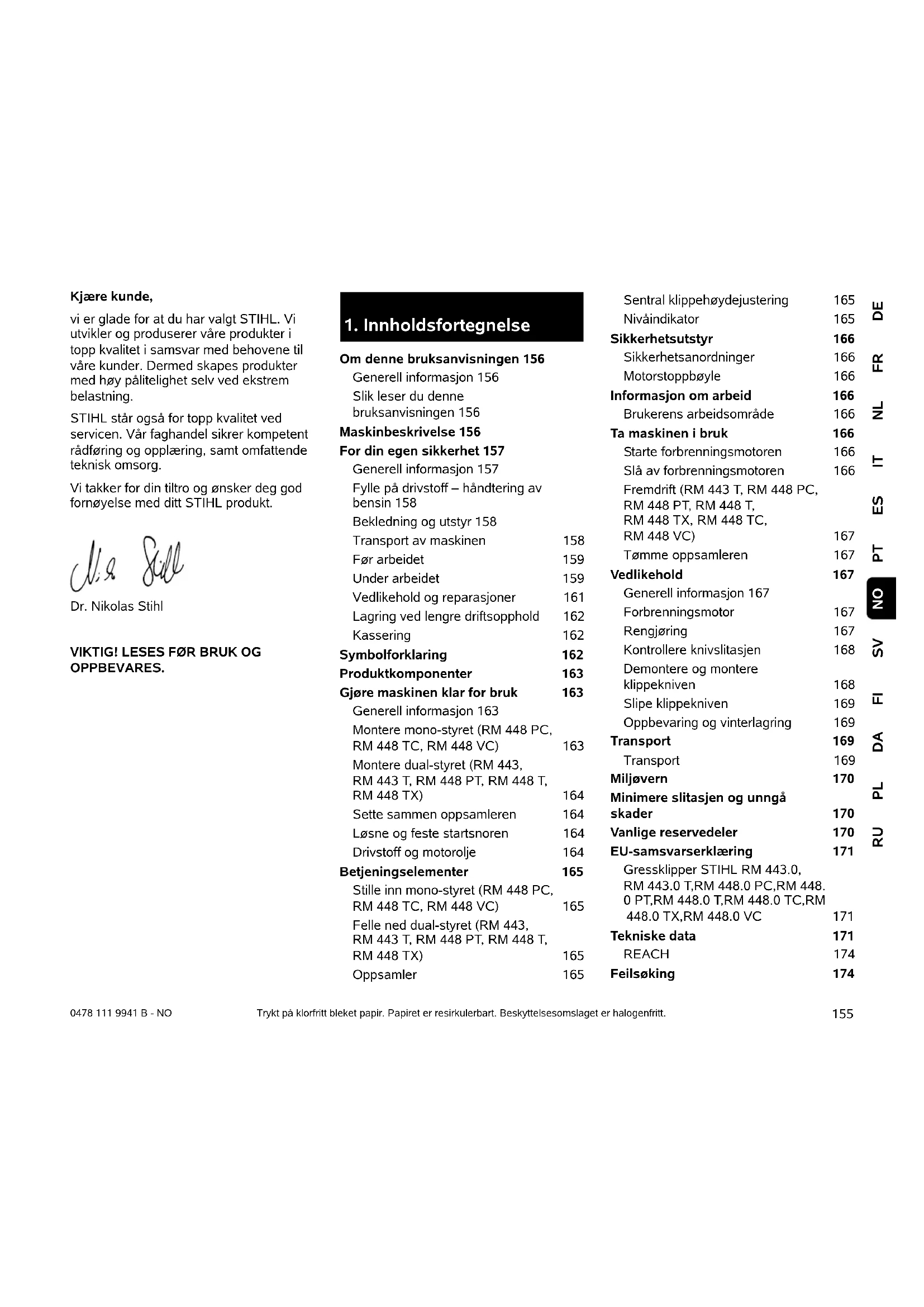 Om denne bruksanvisningen 156 Generell informasjon 156 Slik leser du denne bruksanvisningen 156 Maskinbeskrivelse 156 For din egen sikkerhet 157 Generell informasjon 157 Fylle på drivstoff – håndtering av bensin 158 Bekledning og utstyr 158 Transport av maskinen 158 Før arbeidet 159 Under arbeidet 159 Vedlikehold og reparasjoner 161 Lagring ved lengre driftsopphold 162 Kassering 162 Symbolforklaring 162 Produktkomponenter 163 Gjøre maskinen klar for bruk 163 Generell informasjon 163 Montere mono-styret (RM 448 PC, RM 448 TC, RM 448 VC) 163 Montere dual-styret (RM 443, RM 443 T, RM 448 PT, RM 448 T, RM 448 TX) 164 Sette sammen oppsamleren 164 Løsne og feste startsnoren 164 Drivstoff og motorolje 164 Betjeningselementer 165 Stille inn mono-styret (RM 448 PC, RM 448 TC, RM 448 VC) 165 Felle ned dual-styret (RM 443, RM 443 T, RM 448 PT, RM 448 T, RM 448 TX) 165 Oppsamler 165 Sentral klippehøydejustering 165 Nivåindikator 165 Sikkerhetsutstyr 166 Sikkerhetsanordninger 166 Motorstoppbøyle 166 Informasjon om arbeid 166 Brukerens arbeidsområde 166 Ta maskinen i bruk 166 Starte forbrenningsmotoren 166 Slå av forbrenningsmotoren 166 Fremdrift (RM 443 T, RM 448 PC, RM 448 PT, RM 448 T, RM 448 TX, RM 448 TC, RM 448 VC) 167 Tømme oppsamleren 167 Vedlikehold 167 Generell informasjon 167 Forbrenningsmotor 167 Rengjøring 167 Kontrollere knivslitasjen 168 Demontere og montere klippekniven 168 Slipe klippekniven 169 Oppbevaring og vinterlagring 169 Transport 169 Transport 169 Miljøvern 170 Minimere slitasjen og unngå skader 170 Vanlige reservedeler 170 EU-samsvarserklæring 171 Gressklipper STIHL RM 443.0, RM 443.0 T,RM 448.0 PC,RM 448. 0 PT,RM 448.0 T,RM 448.0 TC,RM