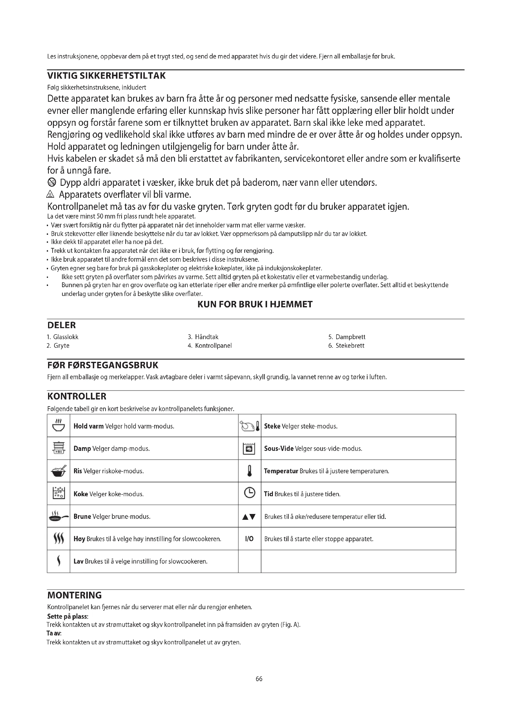 UA66 Les instruksjonene, oppbevar dem på et trygt sted, og send de med apparatet hvis du gir det videre. Fjern all emballasje før bruk. VIKTIG SIKKERHETSTILTAK Følg sikkerhetsinstruksene, inkludert Dette apparatet kan brukes av barn fra åtte år og personer med nedsatte fysiske, sansende eller mentale evner eller manglende erfaring eller kunnskap hvis slike personer har fått opplæring eller blir holdt under oppsyn og forstår farene som er tilknyttet bruken av apparatet. Barn skal ikke leke med apparatet. Rengjøring og vedlikehold skal ikke utføres av barn med mindre de er over åtte år og holdes under oppsyn. Hold apparatet og ledningen utilgjengelig for barn under åtte år. Hvis kabelen er skadet så må den bli erstattet av fabrikanten, servicekontoret eller andre som er kvaliserte for å unngå fare. b Dypp aldri apparatet i væsker, ikke bruk det på baderom, nær vann eller utendørs. ¬ Apparatets overater vil bli varme. Kontrollpanelet må tas av før du vaske gryten. Tørk gryten godt før du bruker apparatet igjen. La det være minst 50 mm fri plass rundt hele apparatet.