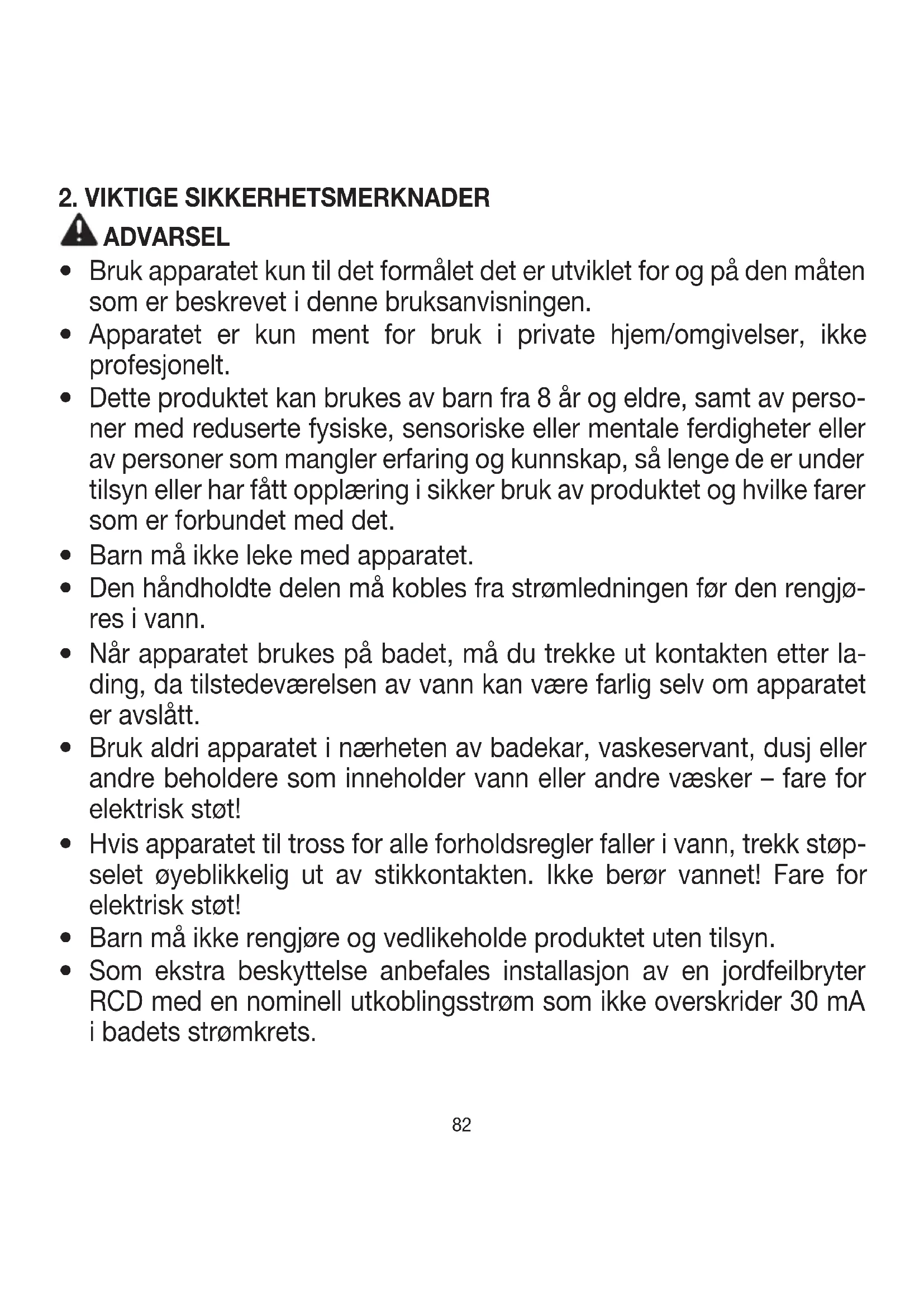 Bruk aldri apparatet i nærheten av badekar, vaskeservant, dusj eller andre beholdere som inneholder vann eller andre væsker – fare for elektrisk støt!