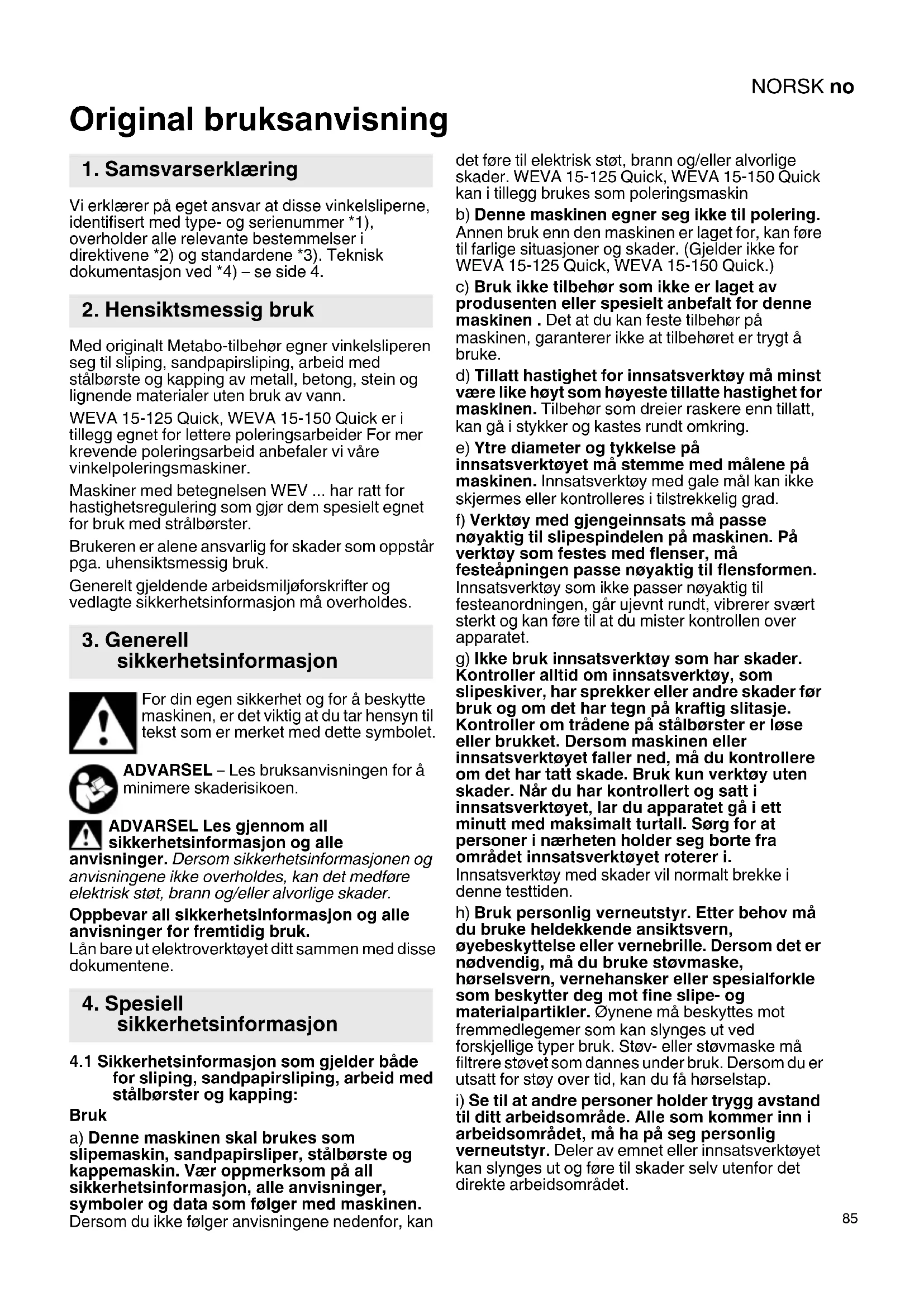 Original bruksanvisning Vi erklærer på eget ansvar at disse vinkelsliperne, identifisert med type- og serienummer *1), overholder alle relevante bestemmelser i direktivene *2) og standardene *3). Teknisk dokumentasjon ved *4) – se side 4. Med originalt Metabo-tilbehør egner vinkelsliperen seg til sliping, sandpapirsliping, arbeid med stålbørste og kapping av metall, betong, stein og lignende materialer uten bruk av vann. WEVA 15-125 Quick, WEVA 15-150 Quick er i tillegg egnet for lettere poleringsarbeider For mer krevende poleringsarbeid anbefaler vi våre vinkelpoleringsmaskiner. Maskiner med betegnelsen WEV ... har ratt for hastighetsregulering som gjør dem spesielt egnet for bruk med strålbørster. Brukeren er alene ansvarlig for skader som oppstår pga. uhensiktsmessig bruk. Generelt gjeldende arbeidsmiljøforskrifter og vedlagte sikkerhetsinformasjon må overholdes. For din egen sikkerhet og for å beskytte maskinen, er det viktig at du tar hensyn til tekst som er merket med dette symbolet. ADVARSEL – Les bruksanvisningen for å minimere skaderisikoen. ADVARSEL Les gjennom all sikkerhetsinformasjon og alle anvisninger. Dersom sikkerhetsinformasjonen og anvisningene ikke overholdes, kan det medføre elektrisk støt, brann og/eller alvorlige skader. Oppbevar all sikkerhetsinformasjon og alle anvisninger for fremtidig bruk. Lån bare ut elektroverktøyet ditt sammen med disse dokumentene.