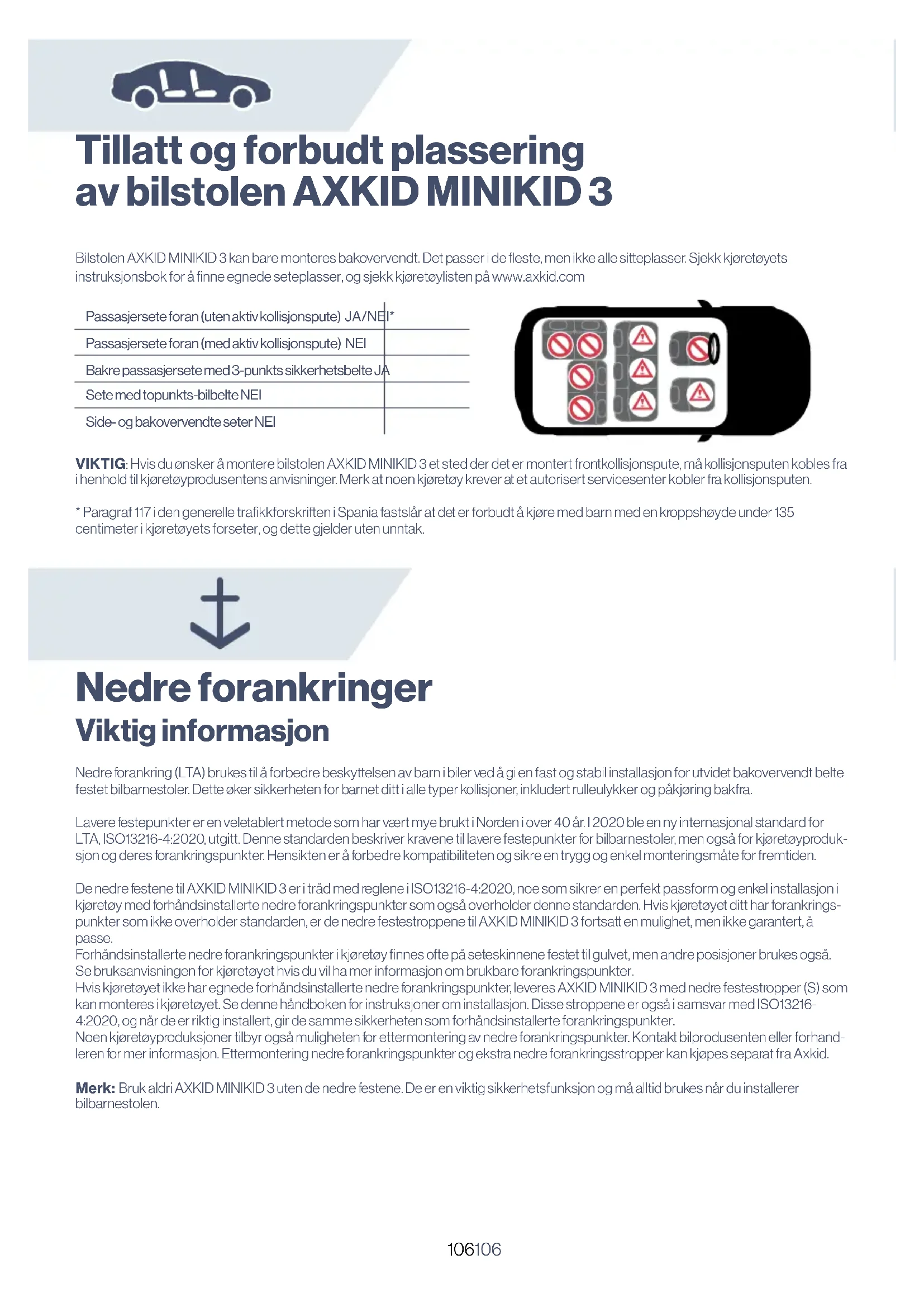 - Paragraf 117 i den generelle trakkforskriften i Spania fastslår at det er forbudt å kjøre med barn med en kroppshøyde under 135 centimeter i kjøretøyets forseter, og dette gjelder uten unntak. Nedre forankringer Viktig informasjon Nedre forankring (LTA) brukes til å forbedre beskyttelsen av barn i biler ved å gi en fast og stabil installasjon for utvidet bakovervendt belte festet bilbarnestoler. Dette øker sikkerheten for barnet ditt i alle typer kollisjoner, inkludert rulleulykker og påkjøring bakfra. Lavere festepunkter er en veletablert metode som har vært mye brukt i Norden i over 40 år. I 2020 ble en ny internasjonal standard for LTA, ISO13216-4:2020, utgitt. Denne standarden beskriver kravene til lavere festepunkter for bilbarnestoler, men også for kjøretøyproduk- sjon og deres forankringspunkter. Hensikten er å forbedre kompatibiliteten og sikre en trygg og enkel monteringsmåte for fremtiden. De nedre festene til AXKID MINIKID 3 er i tråd med reglene i ISO13216-4:2020, noe som sikrer en perfekt passform og enkel installasjon i kjøretøy med forhåndsinstallerte nedre forankringspunkter som også overholder denne standarden. Hvis kjøretøyet ditt har forankrings- punkter som ikke overholder standarden, er de nedre festestroppene til AXKID MINIKID 3 fortsatt en mulighet, men ikke garantert, å passe. Forhåndsinstallerte nedre forankringspunkter i kjøretøy nnes ofte på seteskinnene festet til gulvet, men andre posisjoner brukes også. Se bruksanvisningen for kjøretøyet hvis du vil ha mer informasjon om brukbare forankringspunkter. Hvis kjøretøyet ikke har egnede forhåndsinstallerte nedre forankringspunkter, leveres AXKID MINIKID 3 med nedre festestropper (S) som kan monteres i kjøretøyet. Se denne håndboken for instruksjoner om installasjon. Disse stroppene er også i samsvar med ISO13216- 4:2020, og når de er riktig installert, gir de samme sikkerheten som forhåndsinstallerte forankringspunkter. Noen kjøretøyproduksjoner tilbyr også muligheten for ettermontering av nedre forankringspunkter. Kontakt bilprodusenten eller forhand- leren for mer informasjon. Ettermontering nedre forankringspunkter og ekstra nedre forankringsstropper kan kjøpes separat fra Axkid. Merk: Bruk aldri AXKID MINIKID 3 uten de nedre festene. De er en viktig sikkerhetsfunksjon og må alltid brukes når du installerer bilbarnestolen.107107