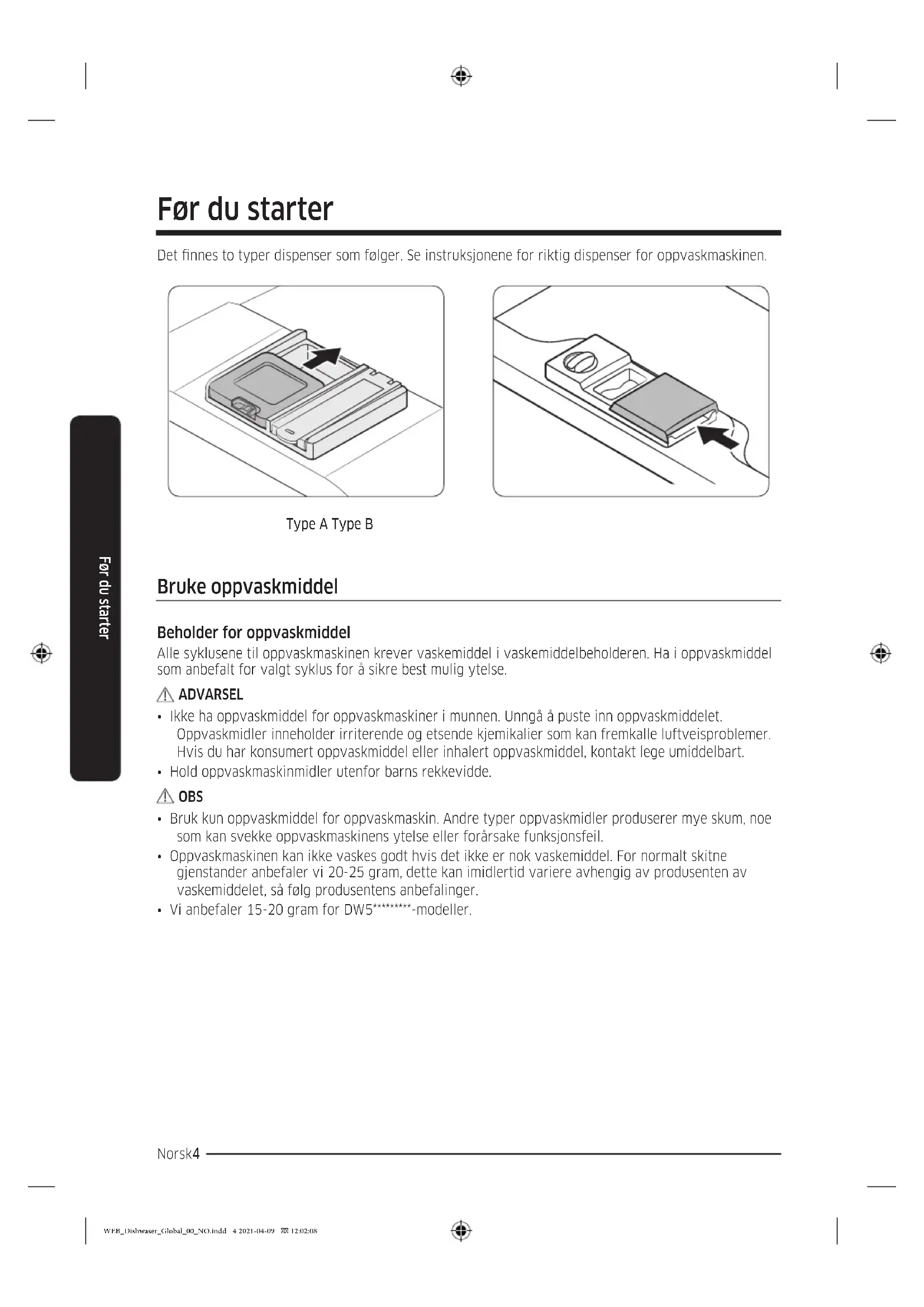 - Når oppvaskmaskinen står i vater, kontrollerer du at døren åpnes og lukkes på riktig vis. WEB_Dishwaser_Global_00_NO.indd 3 2021-04-09 12:02:08Norsk4 Før du starter Før du starter Det nnes to typer dispenser som følger. Se instruksjonene for riktig dispenser for oppvaskmaskinen. Type A Type B Bruke oppvaskmiddel Beholder for oppvaskmiddel Alle syklusene til oppvaskmaskinen krever vaskemiddel i vaskemiddelbeholderen. Ha i oppvaskmiddel som anbefalt for valgt syklus for å sikre best mulig ytelse. ADVARSEL