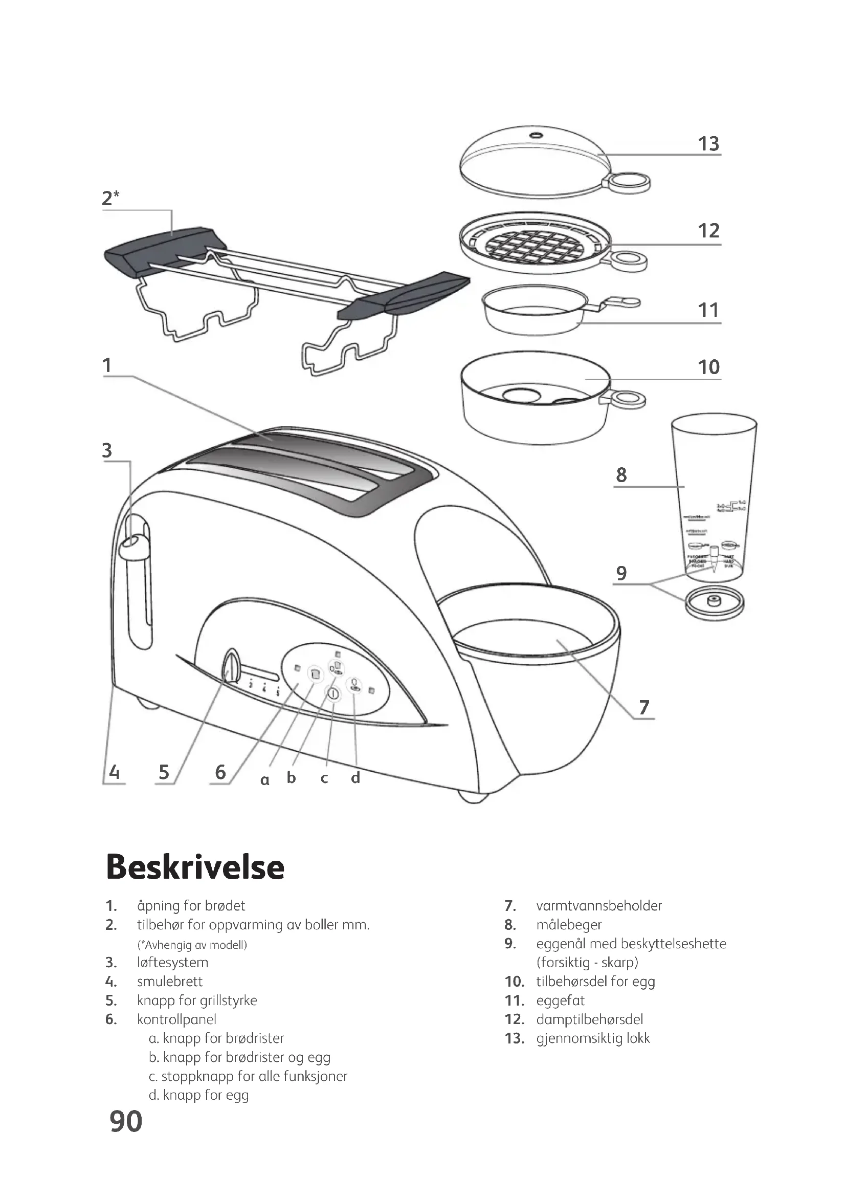 TOASTN'EGG-NC00013044:Mise en page 1 16/10/09 10:39 Page 89Beskrivelse åpning for brødet tilbehør for oppvarming av boller mm. (*Avhengig av modell) løftesystem smulebrett knapp for grillstyrke kontrollpanel a. knapp for brødrister b. knapp for brødrister og egg c. stoppknapp for alle funksjoner d. knapp for egg