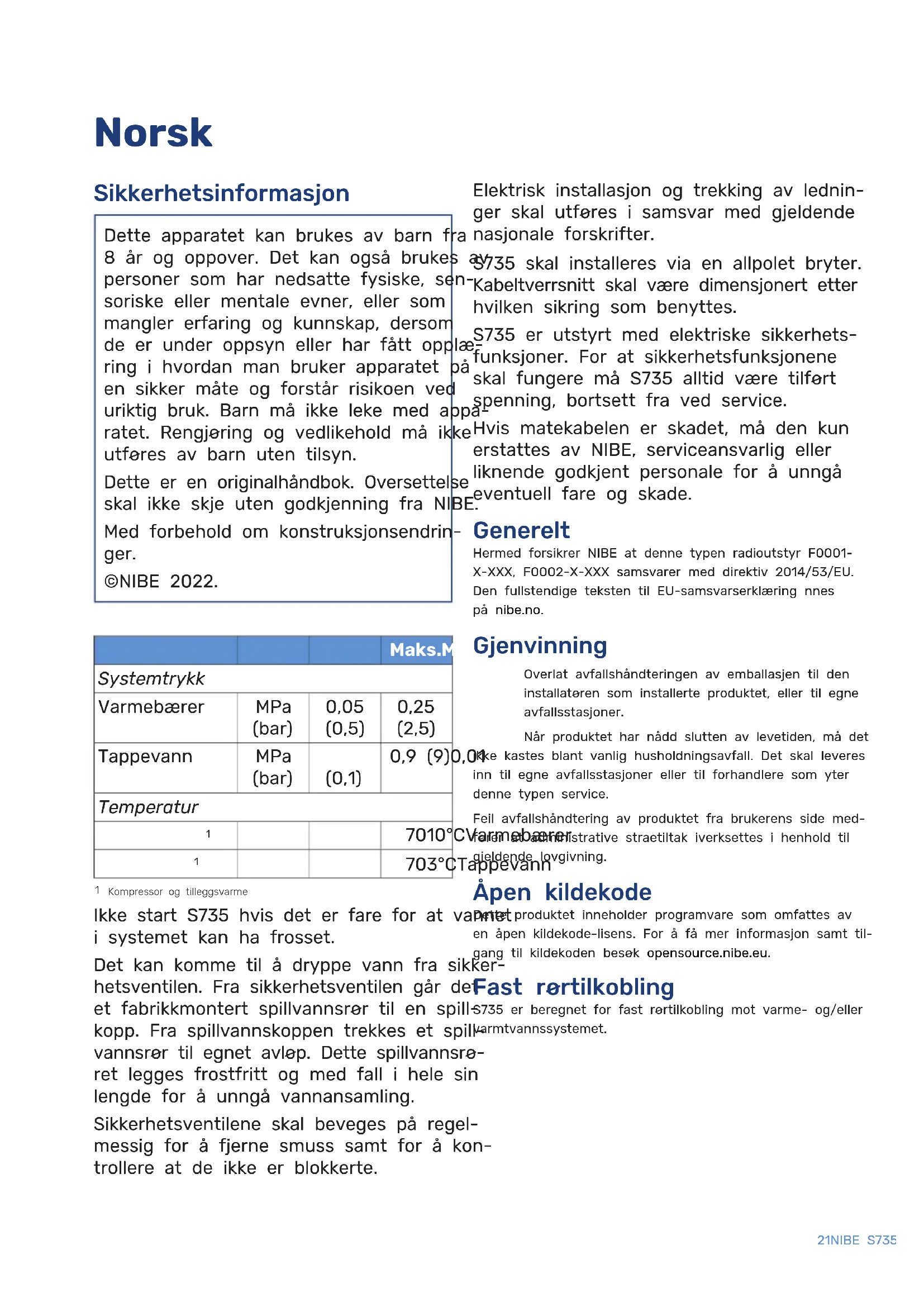 Kompressor og tilleggsvarme Ikke start S735 hvis det er fare for at vannet i systemet kan ha frosset. Det kan komme til å dryppe vann fra sikker- hetsventilen. Fra sikkerhetsventilen går det et fabrikkmontert spillvannsrør til en spill- kopp. Fra spillvannskoppen trekkes et spill- vannsrør til egnet avløp. Dette spillvannsrø- ret legges frostfritt og med fall i hele sin lengde for å unngå vannansamling. Sikkerhetsventilene skal beveges på regel- messig for å fjerne smuss samt for å kon- trollere at de ikke er blokkerte. Elektrisk installasjon og trekking av lednin- ger skal utføres i samsvar med gjeldende nasjonale forskrifter. S735 skal installeres via en allpolet bryter. Kabeltverrsnitt skal være dimensjonert etter hvilken sikring som benyttes. S735 er utstyrt med elektriske sikkerhets- funksjoner. For at sikkerhetsfunksjonene skal fungere må S735 alltid være tilført spenning, bortsett fra ved service. Hvis matekabelen er skadet, må den kun erstattes av NIBE, serviceansvarlig eller liknende godkjent personale for å unngå eventuell fare og skade. Generelt Hermed forsikrer NIBE at denne typen radioutstyr F0001- X-XXX, F0002-X-XXX samsvarer med direktiv 2014/53/EU. Den fullstendige teksten til EU-samsvarserklæring finnes på nibe.no. Gjenvinning Overlat avfallshåndteringen av emballasjen til den installatøren som installerte produktet, eller til egne avfallsstasjoner. Når produktet har nådd slutten av levetiden, må det ikke kastes blant vanlig husholdningsavfall. Det skal leveres inn til egne avfallsstasjoner eller til forhandlere som yter denne typen service. Feil avfallshåndtering av produktet fra brukerens side med- fører at administrative straffetiltak iverksettes i henhold til gjeldende lovgivning. Åpen kildekode Dette produktet inneholder programvare som omfattes av en åpen kildekode-lisens. For å få mer informasjon samt til- gang til kildekoden besøk opensource.nibe.eu. Fast rørtilkobling S735 er beregnet for fast rørtilkobling mot varme- og/eller varmtvannssystemet.