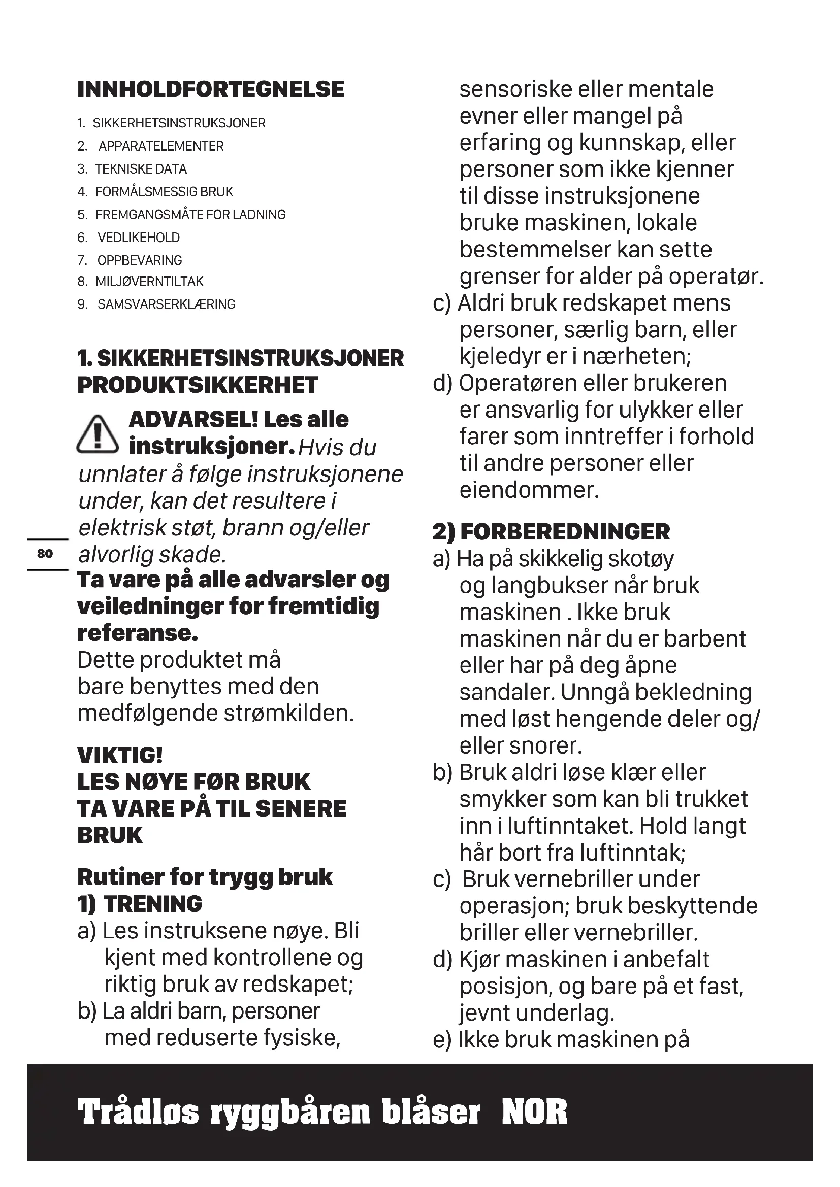 a) Ha på skikkelig skotøy og langbukser når bruk maskinen . Ikke bruk maskinen når du er barbent eller har på deg åpne sandaler. Unngå bekledning med løst hengende deler og/ eller snorer. b) Bruk aldri løse klær eller smykker som kan bli trukket inn i luftinntaket. Hold langt hår bort fra luftinntak; c) Bruk vernebriller under operasjon; bruk beskyttende briller eller vernebriller. d) Kjør maskinen i anbefalt posisjon, og bare på et fast, jevnt underlag. e) Ikke bruk maskinen påTrådløs ryggbåren blåser NOR
