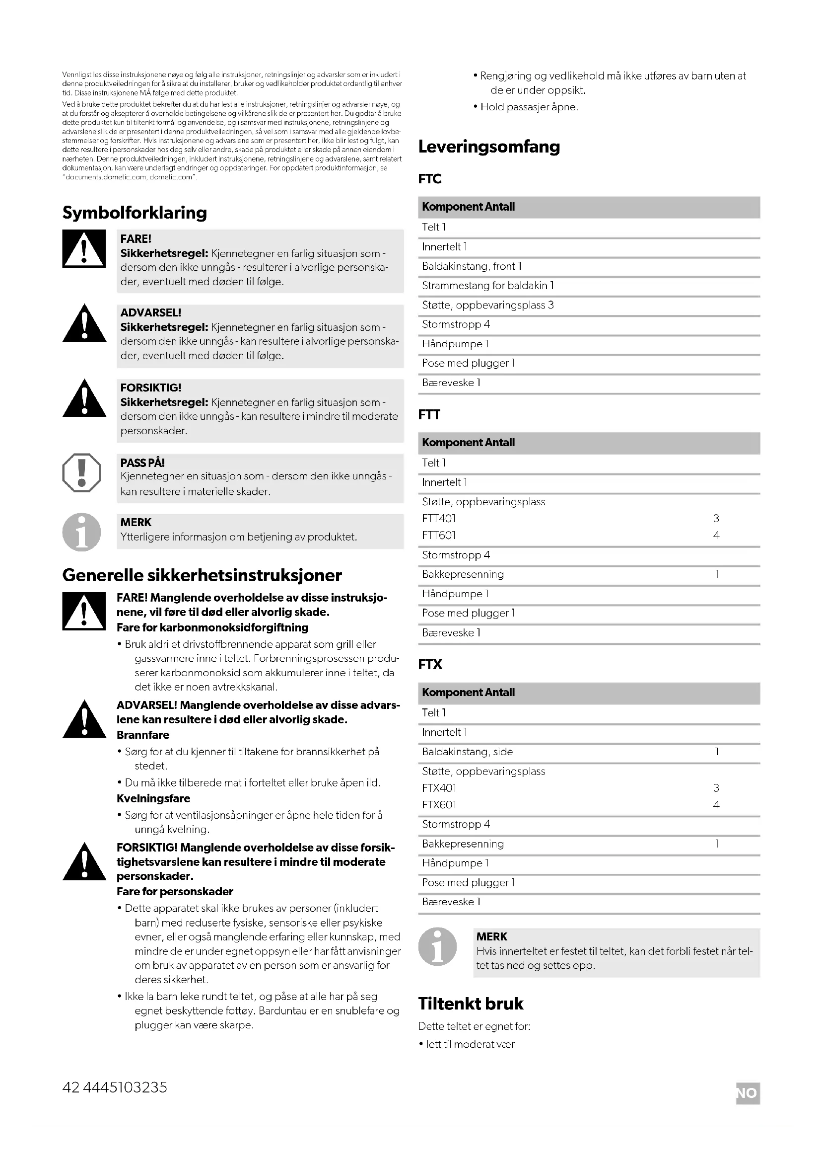 - lett til moderat vær FARE! Sikkerhetsregel: Kjennetegner en farlig situasjon som - dersom den ikke unngås - resulterer i alvorlige personska- der, eventuelt med døden til følge. ADVARSEL! Sikkerhetsregel: Kjennetegner en farlig situasjon som - dersom den ikke unngås - kan resultere i alvorlige personska- der, eventuelt med døden til følge. FORSIKTIG! Sikkerhetsregel: Kjennetegner en farlig situasjon som - dersom den ikke unngås - kan resultere i mindre til moderate personskader. PASS PÅ! Kjennetegner en situasjon som - dersom den ikke unngås - kan resultere i materielle skader. MERK Ytterligere informasjon om betjening av produktet. Komponent Antall Telt 1 Innertelt 1 Baldakinstang, front 1 Strammestang for baldakin 1 Støtte, oppbevaringsplass 3 Stormstropp 4 Håndpumpe 1 Pose med plugger 1 Bæreveske 1 Komponent Antall Telt 1 Innertelt 1 Støtte, oppbevaringsplass FTT401 FTT601