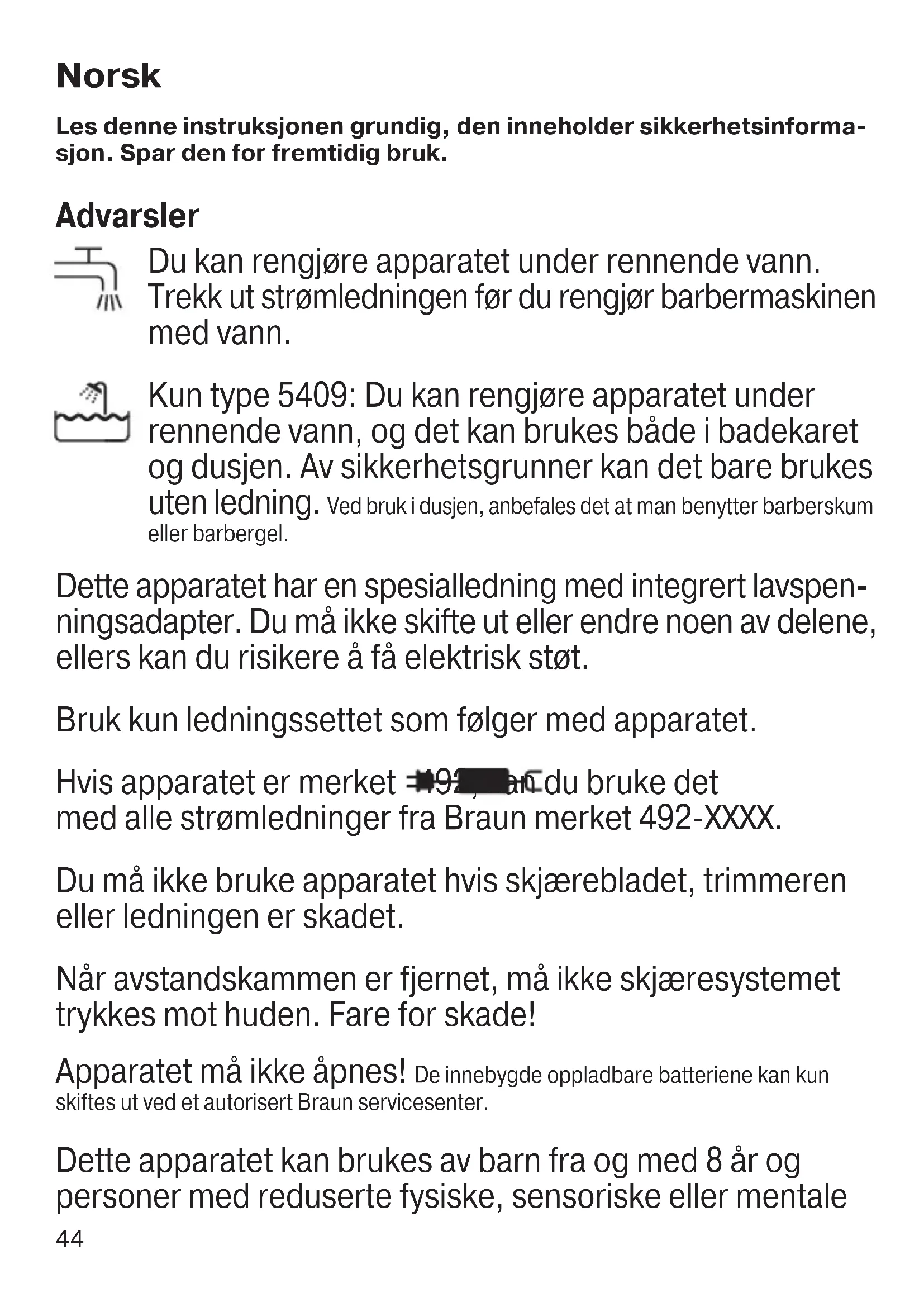 - Bruk en liten børste med myke børstestrå (ikke inkludert) til å rengjøre trimmeren, kammene og innsiden av barbermaskin-/trimmerhodet. Du må imidlertid ikke rengjøre kassetten med skjæreblad og lamellkniv med en børste, for det kan skade den. 91737906_Harmonia_3XX_310s_300s_BT_EURO_S6-136.indd 4691737906_Harmonia_3XX_310s_300s_BT_EURO_S6-136.indd 46 08.02.19 12:5708.02.19 12:57 Business Use - P&G AUTHORIZED POA-00106924 Rev 001 Effective Date 2019-02-14 Printed 2019-04-24 Page 46 of 13647 Hold barbermaskinen din i god stand Barbermaskindeler For å opprettholde 100 % barberingsytelse, må du skifte ut kassetten med skjæreblad og lamellkniv (1) etter ca. 18. måneder eller når den er slitt. Kassett med skjæreblad og lamellkniv: 21B Tilbehør til skjeggstyling: BT32 Vedlikehold av batteriene For å opprettholde full batterikapasitet, må barbermaskinen lades ut ved barbering omtrent hver 6. måned. Deretter lades den opp til full kapasitet igjen. Miljøhensyn Produktet inneholder batterier og/eller resirkulerbart elektrisk avfall. Av miljøhensyn bør ikke dette produktet kastes sammen med husholdningsavfall, men leveres til et Braun servicesenter eller på en kommunal miljøstasjon. Med forbehold om endringer. Garanti Vi gir 2 års garanti på produktet gjeldende fra kjøpsdato. I garantitiden vil vi gratis rette eventuelle fabrikasjons- eller materialfeil, enten ved reparasjon eller om vi finner det hensiktsmessig å bytte hele produktet. Ved eventuell erstatning av produktet kan man erstatningsproduktet ha en annen farge eller være av en tilsvarende modell avhengig av tilgjengelighet. Denne garanti er gyldig i alle land der Braun eller Brauns distributør selger produktet. Denne garantien dekker ikke: skader på grunn av feil bruk, normal slitasje (f.eks. på skjæreblad eller lamellkniven) eller skader som har ubetydelig effekt på produktets verdi og virkemåte sitat slutt. Garantien bortfaller dersom reparasjoner utføres av ikke autorisert person eller hvis andre enn originale Braun reservedeler benyttes. For service i garantitiden skal hele produktet leveres eller sendes sammen med kopi av kjøpskvittering til nærmeste autoriserte Braun Serviceverksted: www.service.braun.com. 91737906_Harmonia_3XX_310s_300s_BT_EURO_S6-136.indd 4791737906_Harmonia_3XX_310s_300s_BT_EURO_S6-136.indd 47 08.02.19 12:5708.02.19 12:57 Business Use - P&G AUTHORIZED POA-00106924 Rev 001 Effective Date 2019-02-14 Printed 2019-04-24 Page 47 of 13648 Ring 22 63 00 93 for å bli henvist til nærmeste autoriserte Braun Service- verksted.