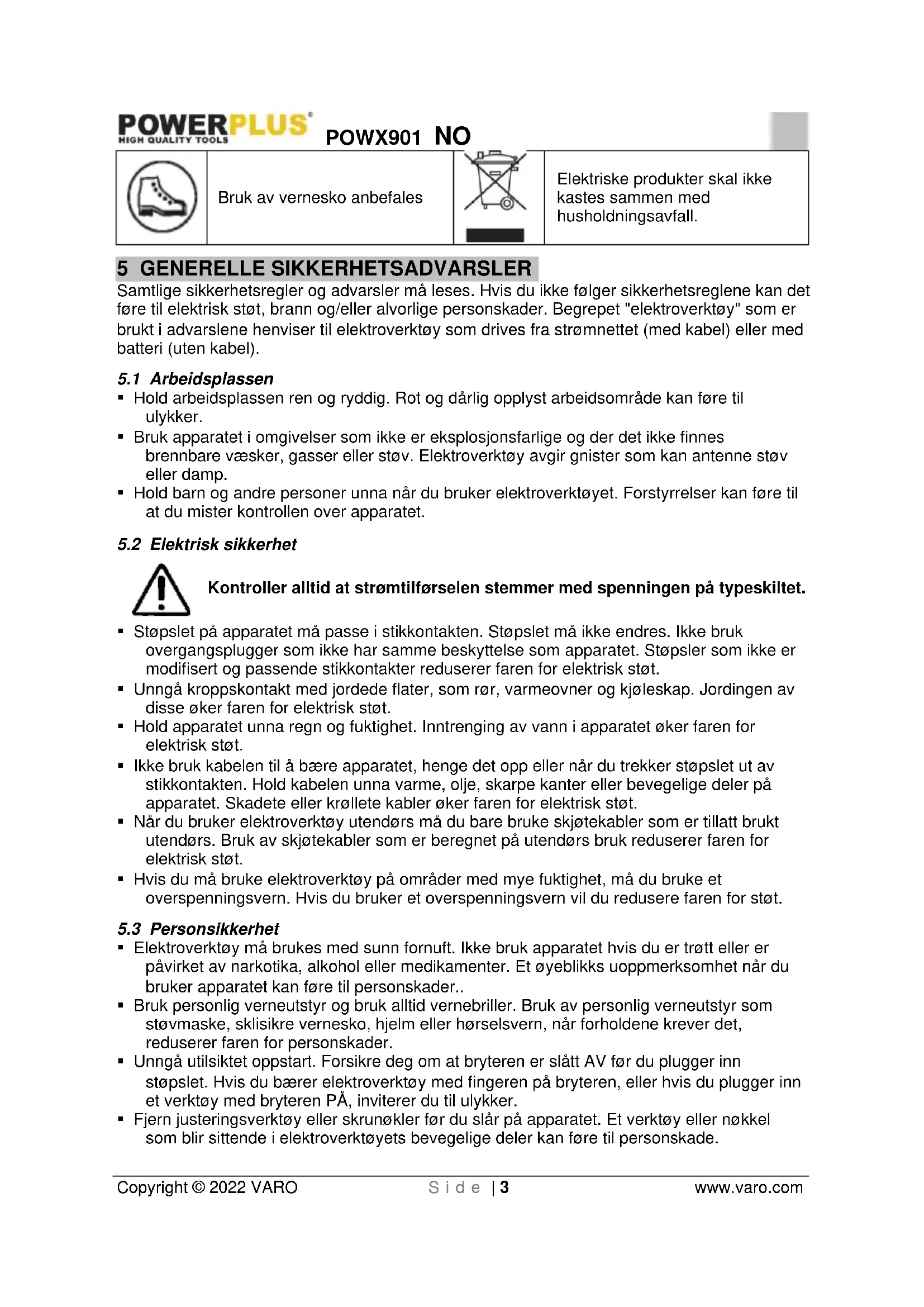 - Fjern justeringsverktøy eller skrunøkler før du slår på apparatet. Et verktøy eller nøkkel som blir sittende i elektroverktøyets bevegelige deler kan føre til personskade.POWX901 NO Copyright © 2022 VARO S i d e | 4 www.varo.com