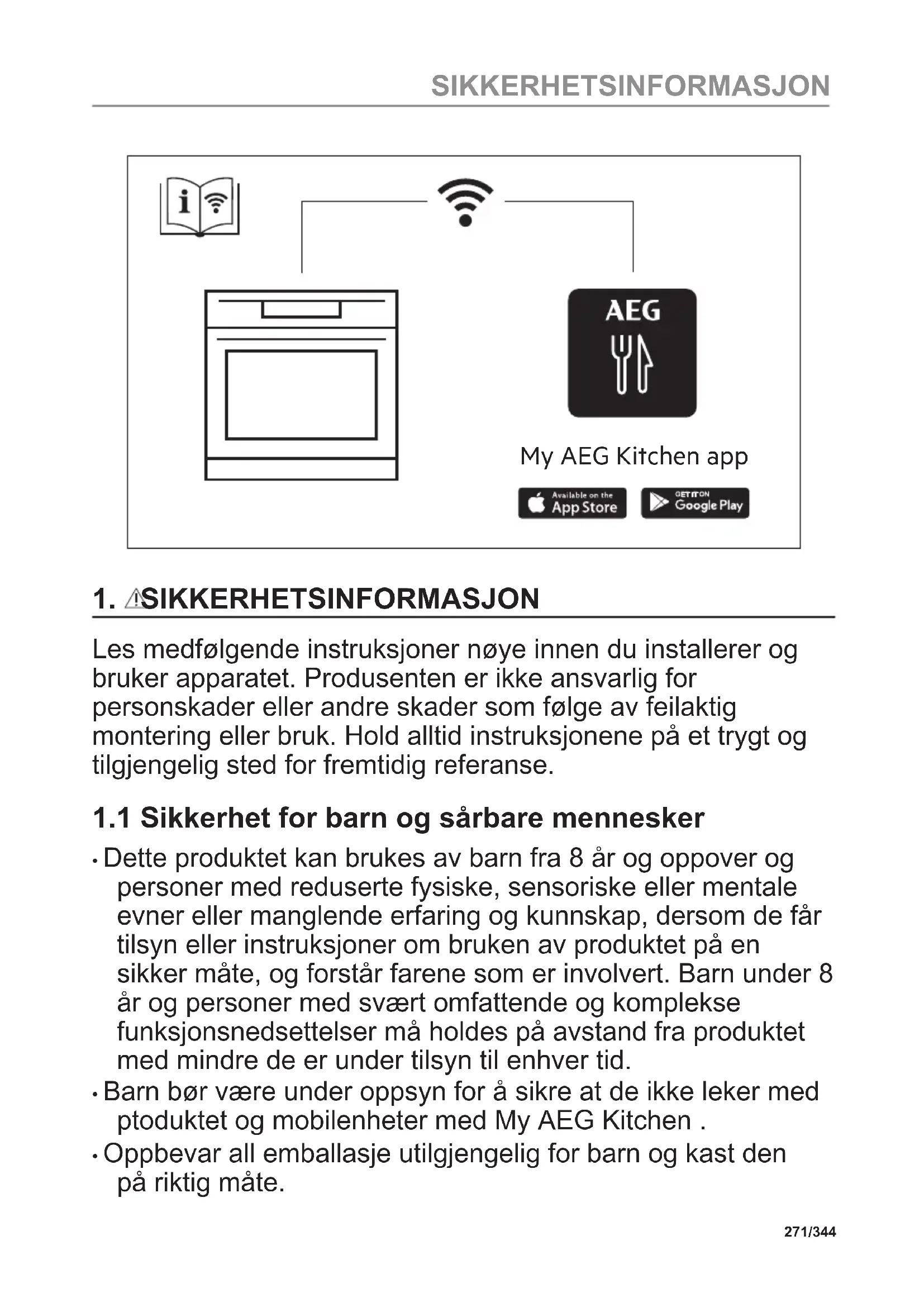 - Barn bør være under oppsyn for å sikre at de ikke leker med ptoduktet og mobilenheter med My AEG Kitchen .