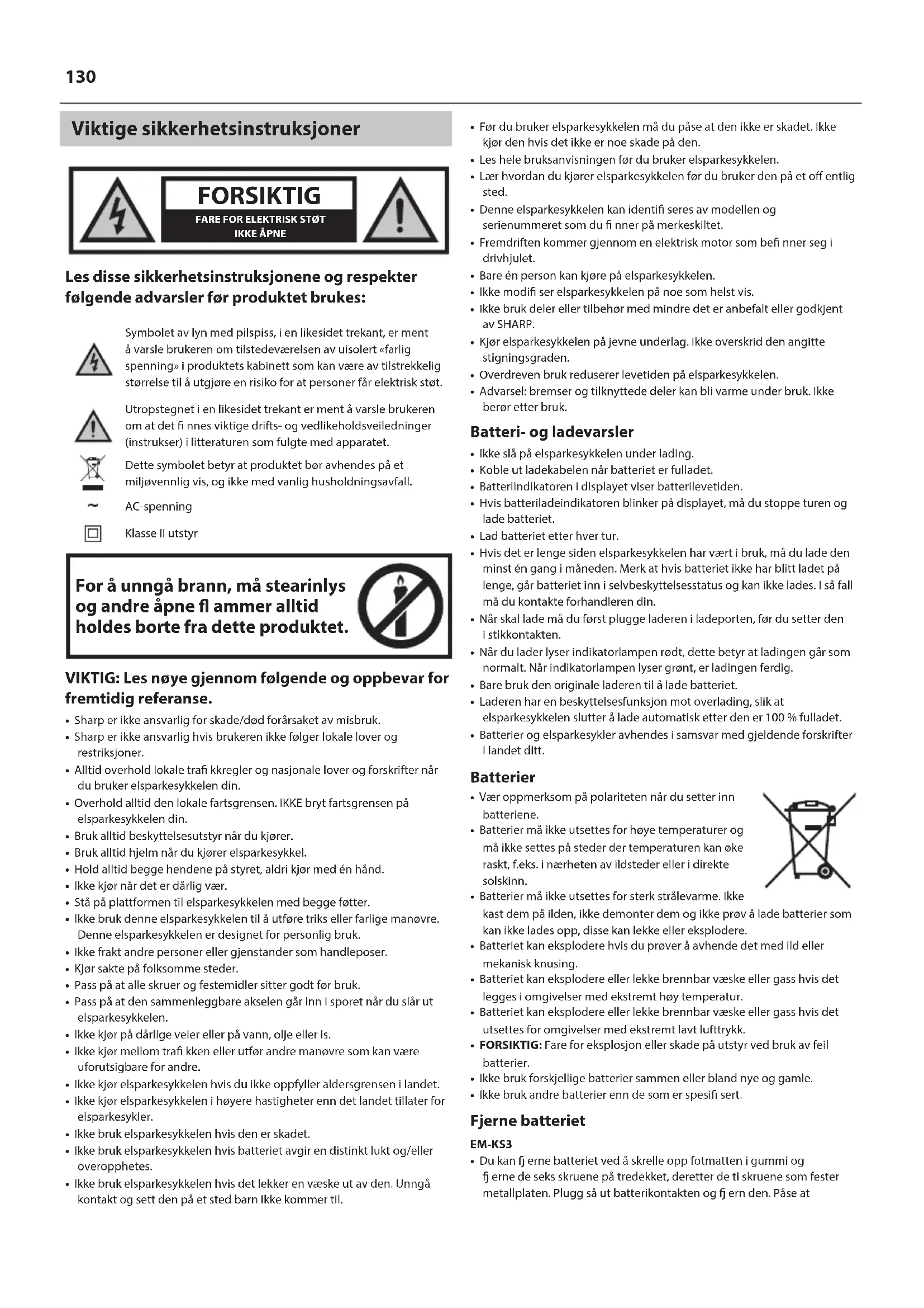- Sharp er ikke ansvarlig for skade/død forårsaket av misbruk.• Sharp er ikke ansvarlig hvis brukeren ikke følger lokale lover og restriksjoner.• Alltid overhold lokale tra kkregler og nasjonale lover og forskrifter når du bruker elsparkesykkelen din.• Overhold alltid den lokale fartsgrensen. IKKE bryt fartsgrensen på elsparkesykkelen din.• Bruk alltid beskyttelsesutstyr når du kjører.• Bruk alltid hjelm når du kjører elsparkesykkel.• Hold alltid begge hendene på styret, aldri kjør med én hånd.• Ikke kjør når det er dårlig vær.• Stå på plattformen til elsparkesykkelen med begge føtter.• Ikke bruk denne elsparkesykkelen til å utføre triks eller farlige manøvre. Denne elsparkesykkelen er designet for personlig bruk.• Ikke frakt andre personer eller gjenstander som handleposer.• Kjør sakte på folksomme steder.• Pass på at alle skruer og festemidler sitter godt før bruk.• Pass på at den sammenleggbare akselen går inn i sporet når du slår ut elsparkesykkelen.• Ikke kjør på dårlige veier eller på vann, olje eller is.• Ikke kjør mellom tra kken eller utfør andre manøvre som kan være uforutsigbare for andre.• Ikke kjør elsparkesykkelen hvis du ikke oppfyller aldersgrensen i landet.• Ikke kjør elsparkesykkelen i høyere hastigheter enn det landet tillater for elsparkesykler.• Ikke bruk elsparkesykkelen hvis den er skadet.• Ikke bruk elsparkesykkelen hvis batteriet avgir en distinkt lukt og/eller overopphetes.• Ikke bruk elsparkesykkelen hvis det lekker en væske ut av den. Unngå kontakt og sett den på et sted barn ikke kommer til.• Før du bruker elsparkesykkelen må du påse at den ikke er skadet. Ikke kjør den hvis det ikke er noe skade på den.• Les hele bruksanvisningen før du bruker elsparkesykkelen.• Lær hvordan du kjører elsparkesykkelen før du bruker den på et o entlig sted.• Denne elsparkesykkelen kan identi seres av modellen og serienummeret som du nner på merkeskiltet.• Fremdriften kommer gjennom en elektrisk motor som be nner seg i drivhjulet.• Bare én person kan kjøre på elsparkesykkelen.• Ikke modi ser elsparkesykkelen på noe som helst vis.• Ikke bruk deler eller tilbehør med mindre det er anbefalt eller godkjent av SHARP.• Kjør elsparkesykkelen på jevne underlag. Ikke overskrid den angitte stigningsgraden.• Overdreven bruk reduserer levetiden på elsparkesykkelen.• Advarsel: bremser og tilknyttede deler kan bli varme under bruk. Ikke berør etter bruk. Batteri- og ladevarsler