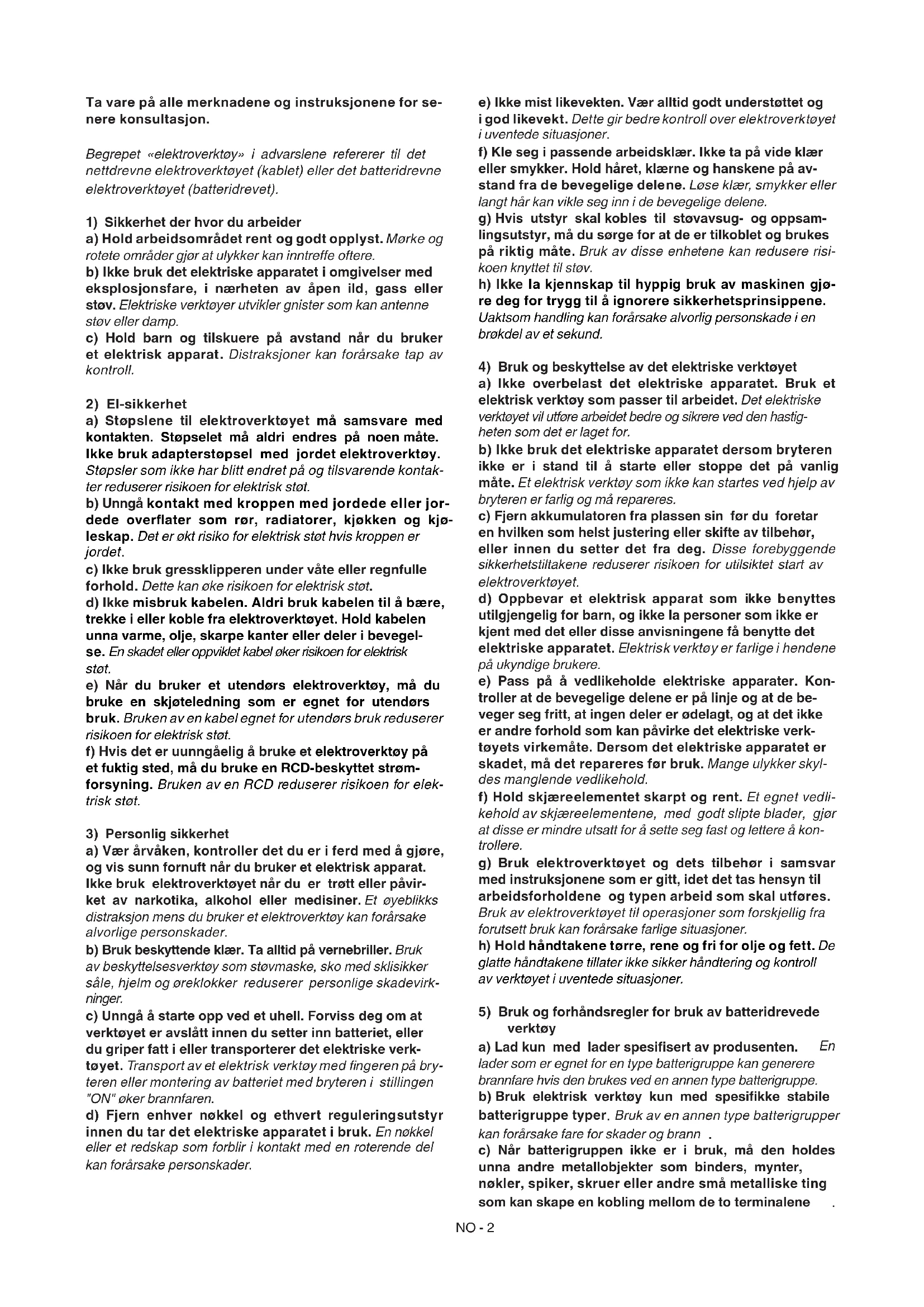 a) Vær årvåken, kontroller det du er i ferd med å gjøre, og vis sunn fornuft når du bruker et elektrisk apparat. Ikke bruk elektroverktøyet når du er trøtt eller påvir- ket av narkotika, alkohol eller medisiner. Et øyeblikks distraksjon mens du bruker et elektroverktøy kan forårsake alvorlige personskader. b) Bruk beskyttende klær. Ta alltid på vernebriller. Bruk av beskyttelsesverktøy som støvmaske, sko med sklisikker såle, hjelm og øreklokker reduserer personlige skadevirk- ninger. c) Unngå å starte opp ved et uhell. Forviss deg om at verktøyet er avslått innen du setter inn batteriet, eller du griper fatt i eller transporterer det elektriske verk- tøyet. Transport av et elektrisk verktøy med ngeren på bry- teren eller montering av batteriet med bryteren i stillingen "ON" øker brannfaren. d) Fjern enhver nøkkel og ethvert reguleringsutstyr innen du tar det elektriske apparatet i bruk. En nøkkel eller et redskap som forblir i kontakt med en roterende del kan forårsake personskader. e) Ikke mist likevekten. Vær alltid godt understøttet og i god likevekt. Dette gir bedre kontroll over elektroverktøyet i uventede situasjoner. f) Kle seg i passende arbeidsklær. Ikke ta på vide klær eller smykker. Hold håret, klærne og hanskene på av- stand fra de bevegelige delene. Løse klær, smykker eller langt hår kan vikle seg inn i de bevegelige delene. g) Hvis utstyr skal kobles til støvavsug- og oppsam- lingsutstyr, må du sørge for at de er tilkoblet og brukes på riktig måte. Bruk av disse enhetene kan redusere risi- koen knyttet til støv. h) Ikke la kjennskap til hyppig bruk av maskinen gjø- re deg for trygg til å ignorere sikkerhetsprinsippene. Uaktsom handling kan forårsake alvorlig personskade i en brøkdel av et sekund.