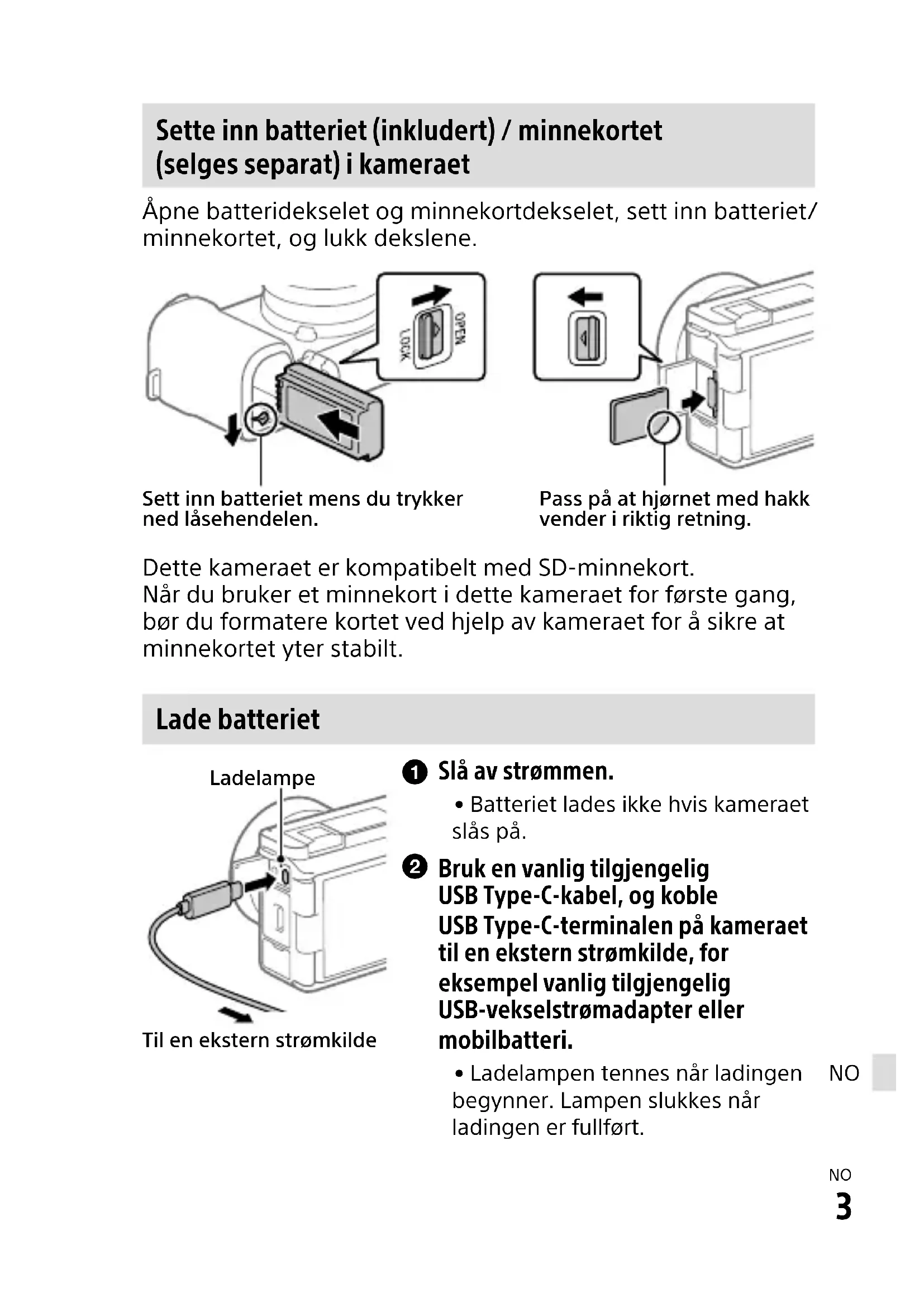 Sette inn batteriet (inkludert) / minnekortet (selges separat) i kameraet Åpne batteridekselet og minnekortdekselet, sett inn batteriet/ minnekortet, og lukk dekslene. Sett inn batteriet mens du trykker ned låsehendelen.Pass på at hjørnet med hakk vender i riktig retning. Dette kameraet er kompatibelt med SD-minnekort. Når du bruker et minnekort i dette kameraet for første gang, bør du formatere kortet ved hjelp av kameraet for å sikre at minnekortet yter stabilt. Lade batteriet LadelampeTil en ekstern strømkilde