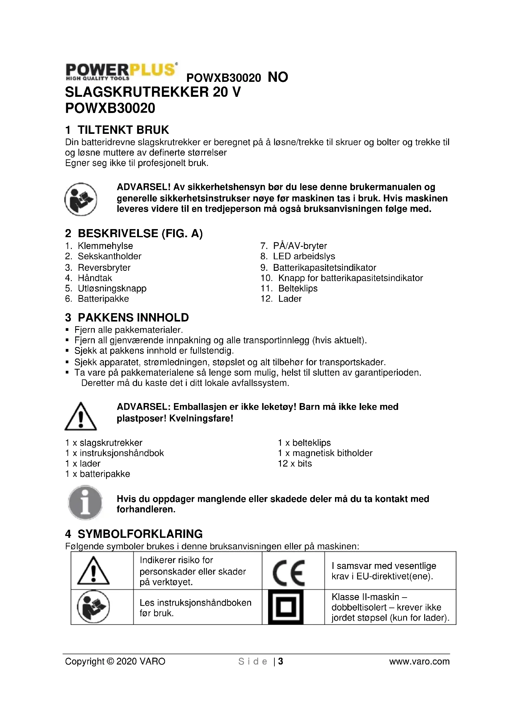 - Verktøyet må lades opp minst én gang per måned for å sikre optimal funksjon.POWXB30020 NO Copyright © 2020 VARO S i d e | 11 www.varo.com 13 MILJØ Hvis maskinen må skiftes ut etter lang tids bruk, må den ikke kastes sammen med husholdningsavfallet. Kast den på en miljøvennlig måte. Avfall produsert av elektriske maskiner bør ikke bli behandlet som normalt husholdningsavfall. Sørg for å resirkulere der hvor spesialanlegg eksisterer. Be lokale myndigheter eller forhandler om råd angående tømming og resirkulering.POWXB30020 DA Copyright © 2020 VARO S i d e | 1 www.varo.com 1 TILSIGTET BRUG ........................................................................... 3