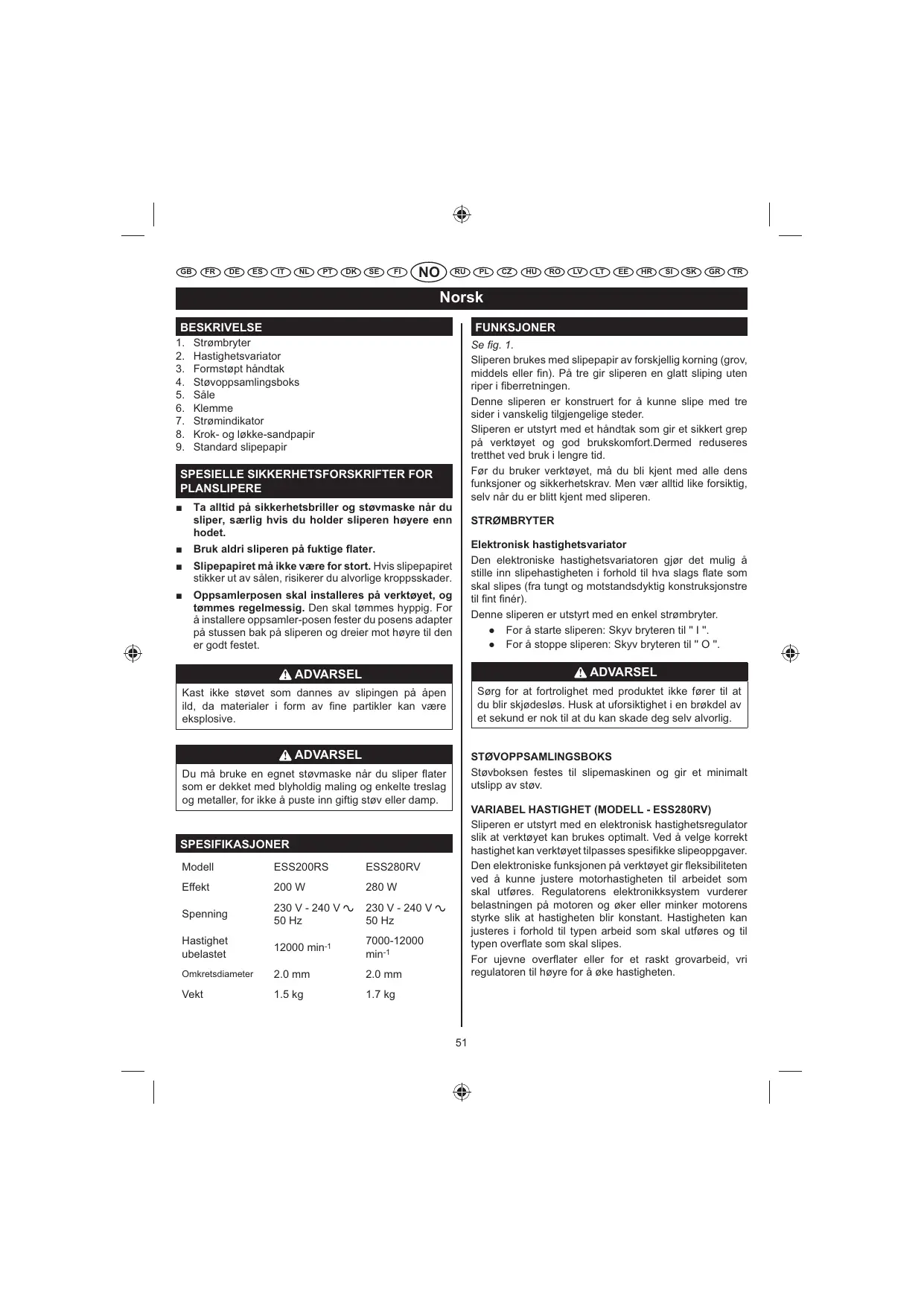 Oppsamlerposen skal installeres på verktøyet, og tømmes regelmessig. Den skal tømmes hyppig. For å installere oppsamler-posen fester du posens adapter på stussen bak på sliperen og dreier mot høyre til den er godt festet. STRØMBRYTER Elektronisk hastighetsvariator Den elektroniske hastighetsvariatoren gjør det mulig å stille inn slipehastigheten i forhold til hva slags Åate som skal slipes (fra tungt og motstandsdyktig konstruksjonstre til Ànt Ànér). Denne sliperen er utstyrt med en enkel strømbryter. È For å starte sliperen: Skyv bryteren til '' I ''. È For å stoppe sliperen: Skyv bryteren til '' O ''. ADVARSEL ADVARSEL Sørg for at fortrolighet med produktet ikke fører til at du blir skjødesløs. Husk at uforsiktighet i en brøkdel av et sekund er nok til at du kan skade deg selv alvorlig. Kast ikke støvet som dannes av slipingen på åpen ild, da materialer i form av Àne partikler kan være eksplosive. ADVARSEL STØVOPPSAMLINGSBOKS Støvboksen festes til slipemaskinen og gir et minimalt utslipp av støv. Du må bruke en egnet støvmaske når du sliper Åater som er dekket med blyholdig maling og enkelte treslag og metaller, for ikke å puste inn giftig støv eller damp. VARIABEL HASTIGHET (MODELL - ESS280RV) Sliperen er utstyrt med en elektronisk hastighetsregulator slik at verktøyet kan brukes optimalt. Ved å velge korrekt hastighet kan verktøyet tilpasses spesiÀkke slipeoppgaver. Den elektroniske funksjonen på verktøyet gir Åeksibiliteten ved å kunne justere motorhastigheten til arbeidet som skal utføres. Regulatorens elektronikksystem vurderer belastningen på motoren og øker eller minker motorens styrke slik at hastigheten blir konstant. Hastigheten kan justeres i forhold til typen arbeid som skal utføres og til typen overÅate som skal slipes. For ujevne overÅater eller for et raskt grovarbeid, vri regulatoren til høyre for å øke hastigheten. SPESIFIKASJONER Modell ESS200RS Effekt 200 W ESS280RV 280 W Spenning 230 V - 240 V 50 Hz 230 V - 240 V 50 Hz Hastighet ubelastet 12000 min-1 7000-12000 min-1 Omkretsdiameter