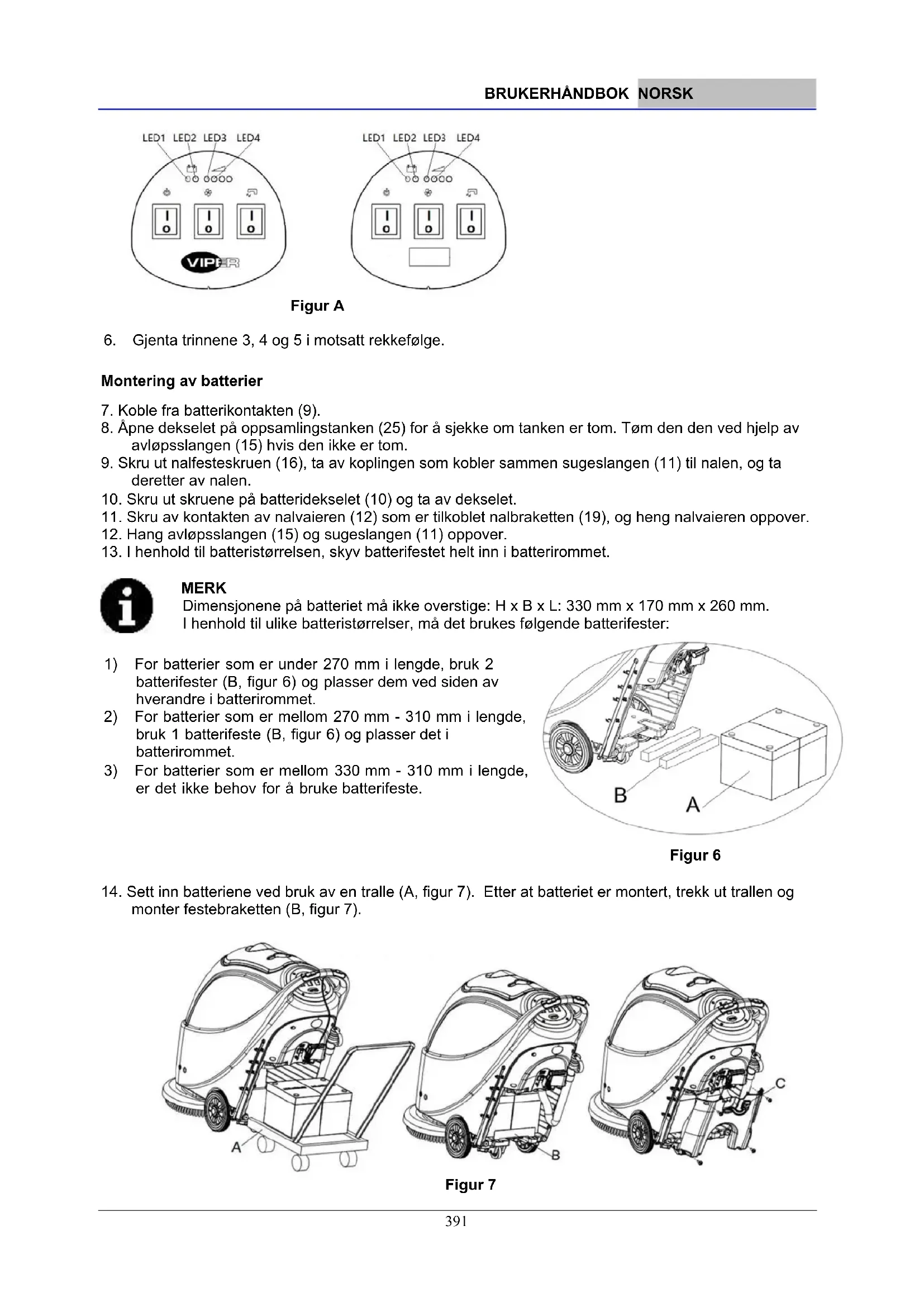 måneder Årlig Lading av batteriet Rengjøring av nal Rengjøring av børste/pad-holder Rengjøring av vanntank og flottørfilter, sjekk av tetningslister på vanntanken Sjekk og skift av nalblad Rengjøring av vannfilteret Rengjøring av sugepumpefilteret Sjekk av væskenivå på våtbatteri Sjekk av stramheten på skruer og muttere (1) Sjekk eller skift av kullbørster på motor for børste/pad-holder (2) Sjekk eller skift av kullbørster på sugepumpen (2) (1) Bør gjøres etter de første 9 driftstimene. (2) Disse vedlikeholdsprose dyrene skal utføres av et autorisert VIPER servicesenter. BATTERILADING MERK Batteriet må lades opp når den gule eller røde lampen begynner å lyse, ell er etter hver bruk av maskinen. FORSIKTIG! For å få en optimal levetid på batteriet, må det alltid holdes oppladet. FORSIKTIG! Når strømmen på batt eriet er for svak, må batteriet lades opp så snart som mulig. Det beste er å sjekke batteriet minst én gang i uken. FORSIKTIG! Hvis maskinen ikke er utstyrt med innebygd lader, kan en egnet ekstern lader brukes for å lade batteriet. ADVARSEL! Det må utv ises forsiktighet ved lading av batteriet, da det kan oppstå syrelekkasje under ladeprosessen. Batterisyre er etsende. Hvis huden eller øyene ved et uhell kommer i kontakt med batterisyre, må du skylle med rikelige mengder vann og kontakte lege.