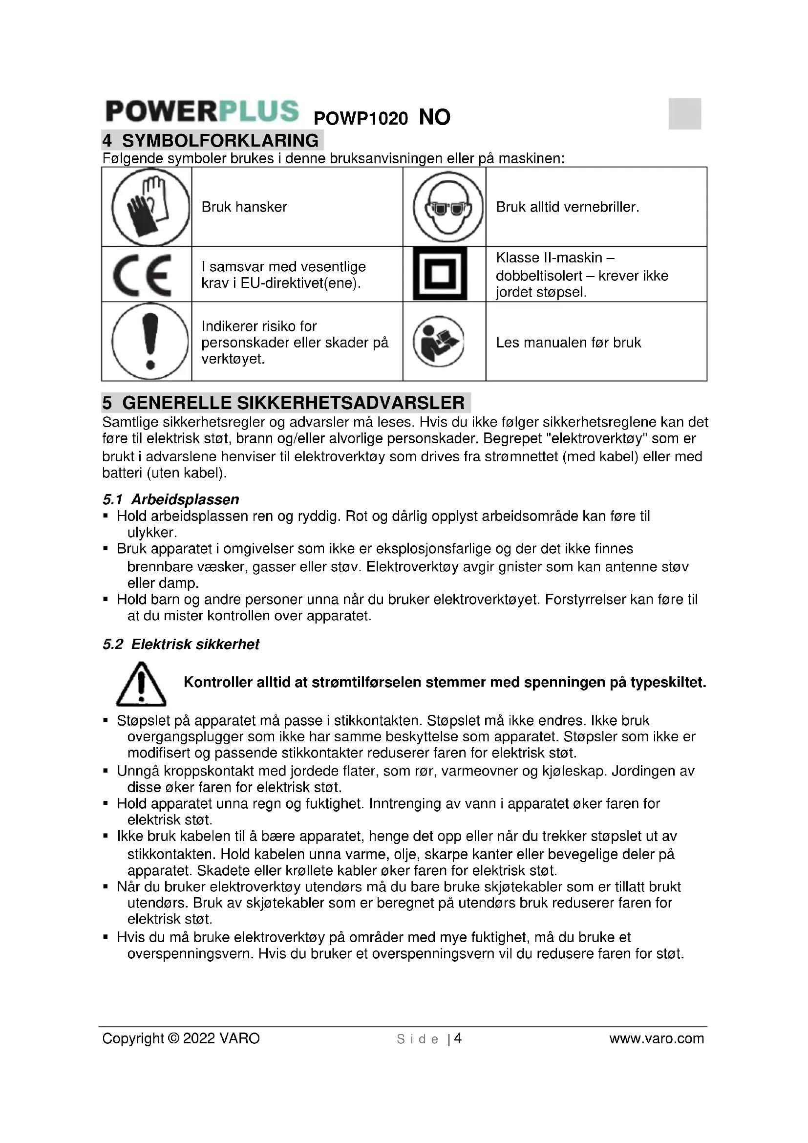 - Hvis du må bruke elektroverktøy på områder med mye fuktighet, må du bruke et overspenningsvern. Hvis du bruker et overspenningsvern vil du redusere faren for støt.POWP1020 NO Copyright © 2022 VARO S i d e | 5 www.varo.com