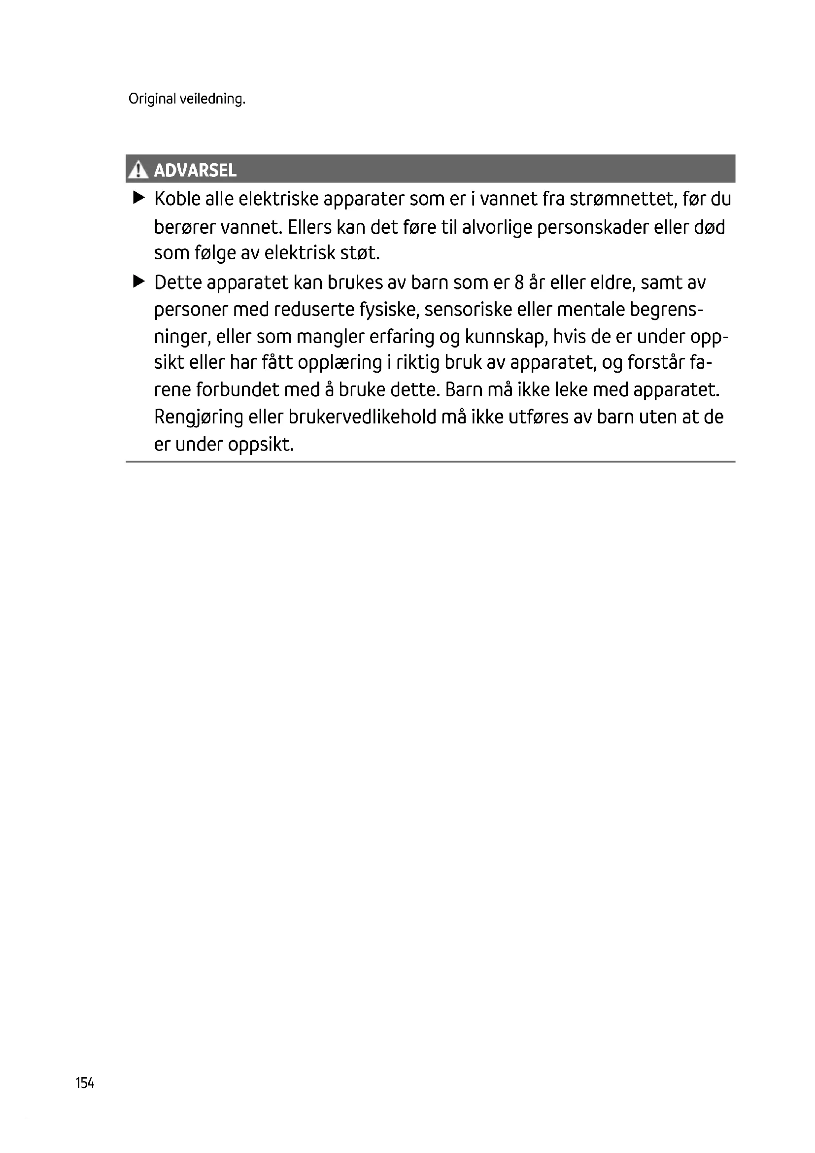ADVAR SEL ADVARSEL Koble alle elektriske apparater som er i vannet fra strømnettet, før du berører vannet. Ellers kan det føre til alvorlige personskader eller død som følge av elektrisk støt. Dette apparatet kan brukes av barn som er 8 år eller eldre, samt av personer med reduserte fysiske, sensoriske eller mentale begrens- ninger, eller som mangler erfaring og kunnskap, hvis de er under opp- sikt eller har fått opplæring i riktig bruk av apparatet, og forstår fa- rene forbundet med å bruke dette. Barn må ikke leke med apparatet. Rengjøring eller brukervedlikehold må ikke utføres av barn uten at de er under oppsikt.NO