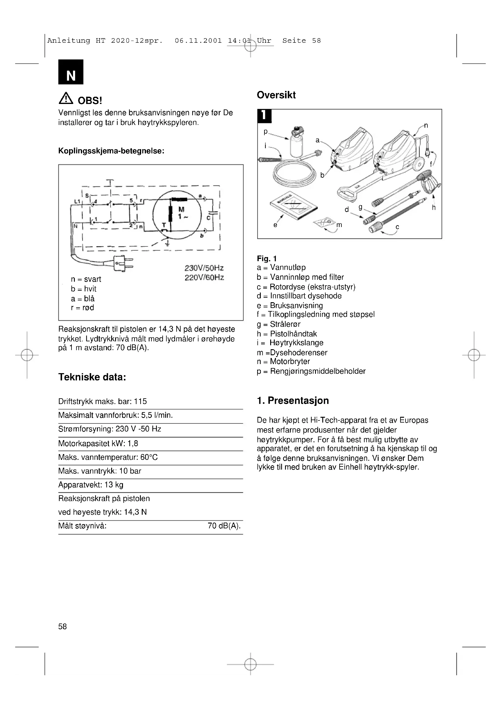 Anleitung HT 2020-12spr. 06.11.2001 14:01 Uhr Seite 582. Sikkerhetsforskrifter OBS: Høytrykkspyleren skal aldri brukes sammen med antennelige, giftige hhv. med slike væsker som har negativ innflytelse på høytrykkspylerens forskriftsmessige drift. Det er fare for eksplosjon eller forgiftning. Vannstrålen skal aldri rettes mot personer, dyr eller planter. Vannstrålen skal aldri rettes mot høytrykkspyleren, elektriske deler hhv. andre elektriske apparat for å unngå fare for strømstøt. Høytrykkspyleren skal aldri brukes ute i regnvær. Det er fare for kortslutning. Høytrykkspyleren skal aldri brukes av barn eller ubeføyete personer. Her er det fare for skader. Støpsel hhv. stikkontakten skal aldri berøres med våte hender, ellers er det fare for strømstøt. Høytrykkspyleren skal aldri drives med skadet strømkabel for å unngå fare for strømstøt og kortslutning. Høytrykkspyleren skal aldri drives med skadet høytrykkslange. Ellers er det fare for sprekking. Pistolens avtrykker skal aldri låses i driftstilling. Herved er det fare for skader. Styreventilens innstilling skal aldri forandres eller forstilles. Ellers er det fare for sprekking. Strålens originaldiameter skal aldri forandres for å unngå driftsforstyrrelser. La aldri høytrykkspyleren være uten oppsyn. Høytrykkspyleren skal, for å unngå fare for kortslutning, ikke transportéres ved å holde i strømkabelen. Sikkerhetsforholdsregler Alle strømførende deler skal beskyttes mot vannsprut, ellers er det fare for kortslutning. Høytrykkspyleren skal kun tilkoples en strømkilde som er forskritsmessig jordet. Det gis ekstra personlig sikkerhet, hvis apparatet er utstyrt med et 3mA feilstømrelé. Høytrykket kan forårsake tilbakestøt av deler. Derfor skal det alltid brukes verneklær og vernebriller når det arbeides med høytrykkspyleren. Før alle arbeider med høytrykkspyleren, skal nettstikkontakten absolutt trekkes ut for å unngå at apparatet slår seg på utilsiktet. Ved betjening av avtrykkeren skal pistolen holdes godt fast pga. det trykkbetingete tilbakestøtet. Ta hensyn til det lokale vannverkets forskrifter. I henhold til DIN 1988 er det kun mulig å kople høytrykkspyleren til drikkevannsledningen, hvis det i tilføringsledningen er installért en beskyttelsesanordning mot opphopning med tømming. Vedlikehold hhv. reparasjoner av eletriske komponenter skal kun gjennomføres av fagfolk. Før slangen koples fra høytrykkspyleren, skal resttrykket absolutt slippes ut. Før bruk og med regelmessige mellomrom skal det kontrolléres om skrudelene låser seg riktig og høytrykkspylerens komponenter skal sjekkes om de er hele hhv. slitte. Personer og dyr skal holde en sikkerhetsavstand på minst 15 meter fra høytrykkspyleren.