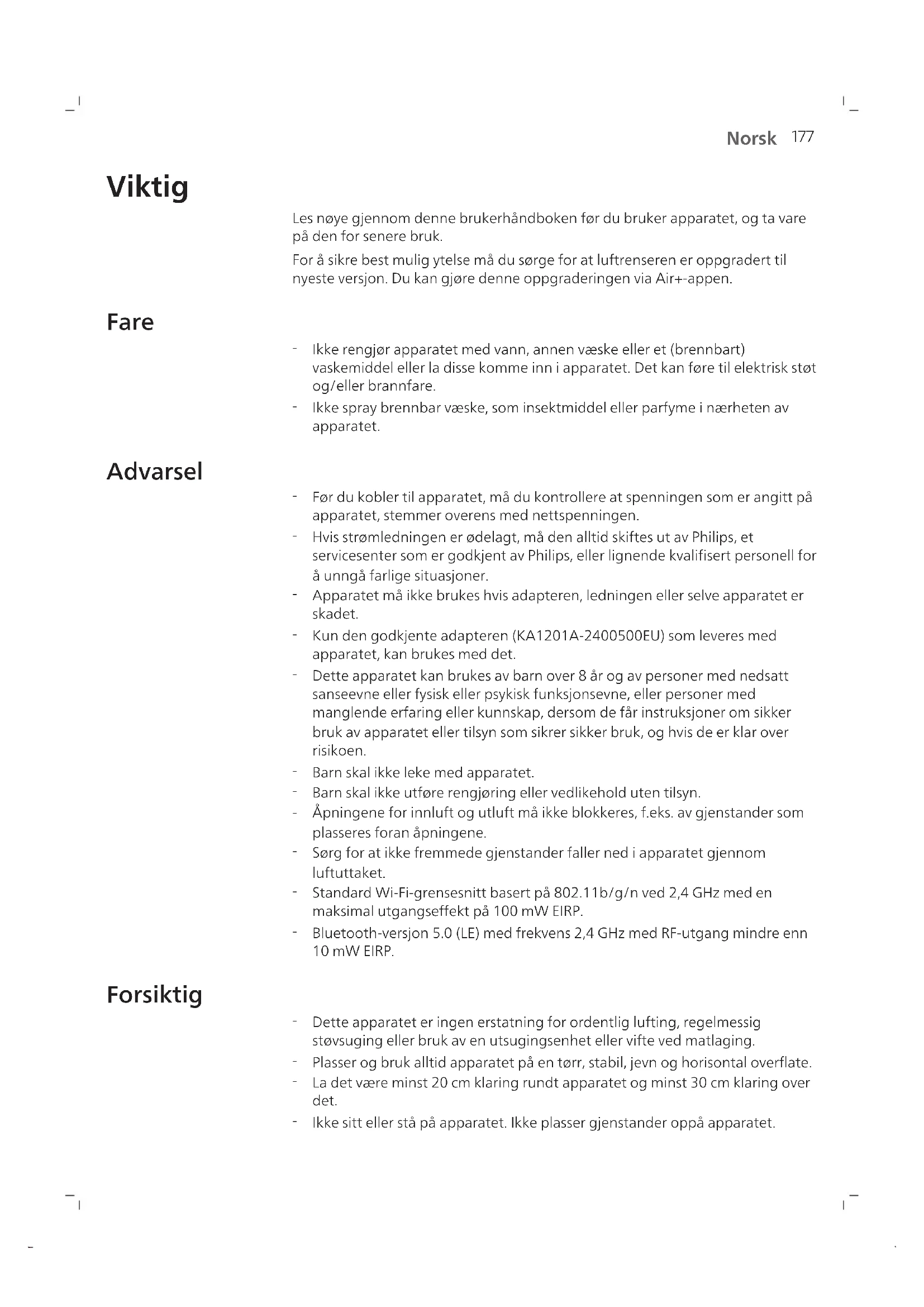 Norsk Viktig Les nøye gjennom denne brukerhåndboken før du bruker apparatet, og ta vare på den for senere bruk. For å sikre best mulig ytelse må du sørge for at luftrenseren er oppgradert til nyeste versjon. Du kan gjøre denne oppgraderingen via Air+-appen. Fare