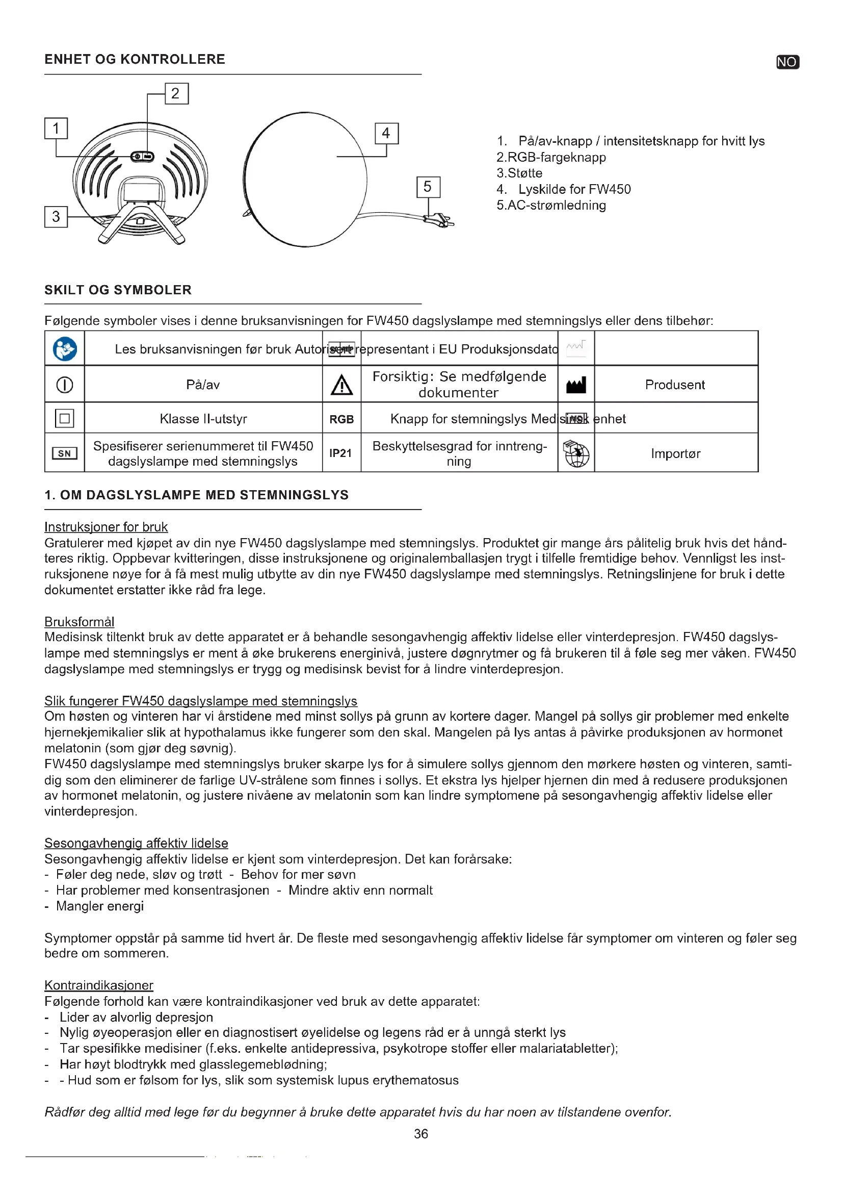 Instruksjoner for bruk Gratulerer med kjøpet av din nye FW450 dagslyslampe med stemningslys. Produktet gir mange års pålitelig bruk hvis det hånd- teres riktig. Oppbevar kvitteringen, disse instruksjonene og originalemballasjen trygt i tilfelle fremtidige behov. Vennligst les inst- ruksjonene nøye for å få mest mulig utbytte av din nye FW450 dagslyslampe med stemningslys. Retningslinjene for bruk i dette dokumentet erstatter ikke råd fra lege. Bruksformål Medisinsk tiltenkt bruk av dette apparatet er å behandle sesongavhengig aektiv lidelse eller vinterdepresjon. FW450 dagslys- lampe med stemningslys er ment å øke brukerens energinivå, justere døgnrytmer og få brukeren til å føle seg mer våken. FW450 dagslyslampe med stemningslys er trygg og medisinsk bevist for å lindre vinterdepresjon. Slik fungerer FW450 dagslyslampe med stemningslys Om høsten og vinteren har vi årstidene med minst sollys på grunn av kortere dager. Mangel på sollys gir problemer med enkelte hjernekjemikalier slik at hypothalamus ikke fungerer som den skal. Mangelen på lys antas å påvirke produksjonen av hormonet melatonin (som gjør deg søvnig). FW450 dagslyslampe med stemningslys bruker skarpe lys for å simulere sollys gjennom den mørkere høsten og vinteren, samti- dig som den eliminerer de farlige UV-strålene som nnes i sollys. Et ekstra lys hjelper hjernen din med å redusere produksjonen av hormonet melatonin, og justere nivåene av melatonin som kan lindre symptomene på sesongavhengig aektiv lidelse eller vinterdepresjon. Sesongavhengig aektiv lidelse Sesongavhengig aektiv lidelse er kjent som vinterdepresjon. Det kan forårsake: - Føler deg nede, sløv og trøtt - Behov for mer søvn - Har problemer med konsentrasjonen - Mindre aktiv enn normalt - Mangler energi Symptomer oppstår på samme tid hvert år. De este med sesongavhengig aektiv lidelse får symptomer om vinteren og føler seg bedre om sommeren. Kontraindikasjoner Følgende forhold kan være kontraindikasjoner ved bruk av dette apparatet: - Lider av alvorlig depresjon - Nylig øyeoperasjon eller en diagnostisert øyelidelse og legens råd er å unngå sterkt lys - Tar spesikke medisiner (f.eks. enkelte antidepressiva, psykotrope stoer eller malariatabletter); - Har høyt blodtrykk med glasslegemeblødning; - - Hud som er følsom for lys, slik som systemisk lupus erythematosus Rådfør deg alltid med lege før du begynner å bruke dette apparatet hvis du har noen av tilstandene ovenfor.