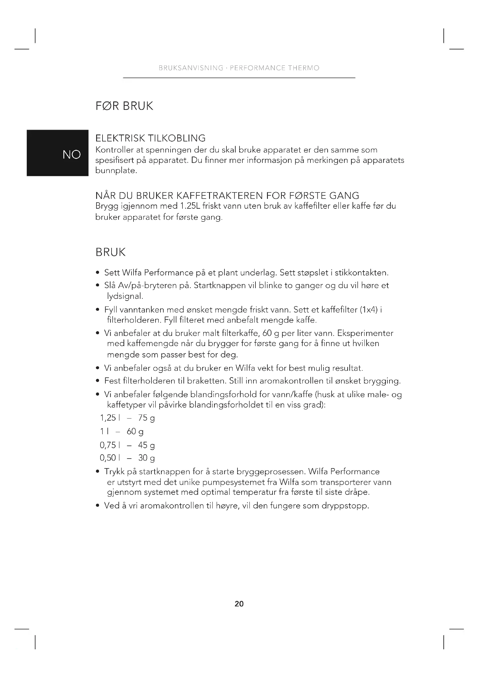ELEKTRISK TILKOBLING Kontroller at spenningen der du skal bruke apparatet er den samme som spesisert på apparatet. Du nner mer informasjon på merkingen på apparatets bunnplate. NÅR DU BRUKER KAFFETRAKTEREN FOR FØRSTE GANG Brygg igjennom med 1.25L friskt vann uten bruk av kaffelter eller kaffe før du bruker apparatet for første gang. BRUK