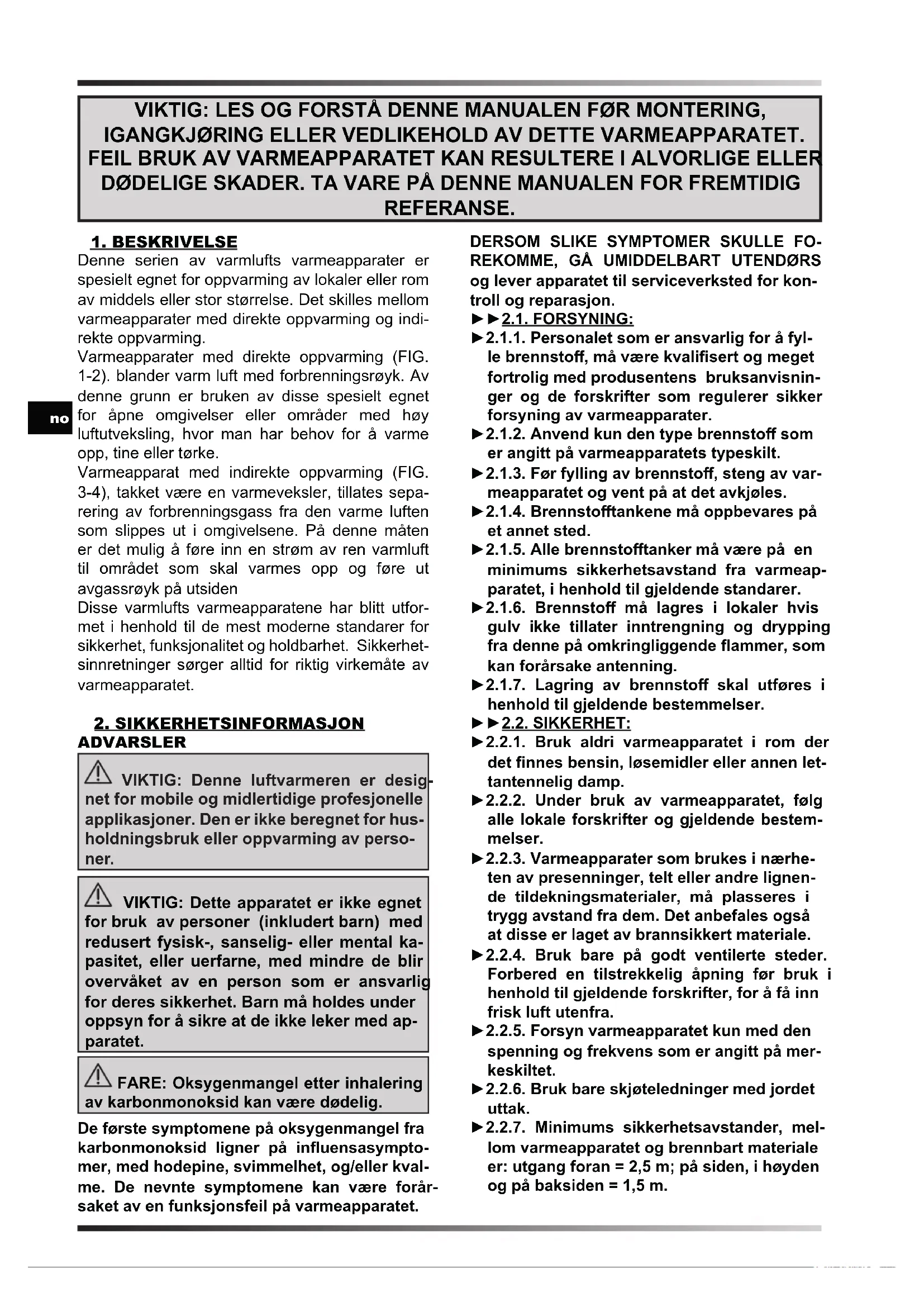 ADVARSLER VIKTIG: Denne luftvarmeren er desig- net for mobile og midlertidige profesjonelle applikasjoner. Den er ikke beregnet for hus- holdningsbruk eller oppvarming av perso- ner. VIKTIG: Dette apparatet er ikke egnet for bruk av personer (inkludert barn) med redusert fysisk-, sanselig- eller mental ka- pasitet, eller uerfarne, med mindre de blir overvåket av en person som er ansvarlig for deres sikkerhet. Barn må holdes under oppsyn for å sikre at de ikke leker med ap- paratet. FARE: Oksygenmangel etter inhalering av karbonmonoksid kan være dødelig. De første symptomene på oksygenmangel fra karbonmonoksid ligner på inuensasympto- mer, med hodepine, svimmelhet, og/eller kval- me. De nevnte symptomene kan være forår- saket av en funksjonsfeil på varmeapparatet.