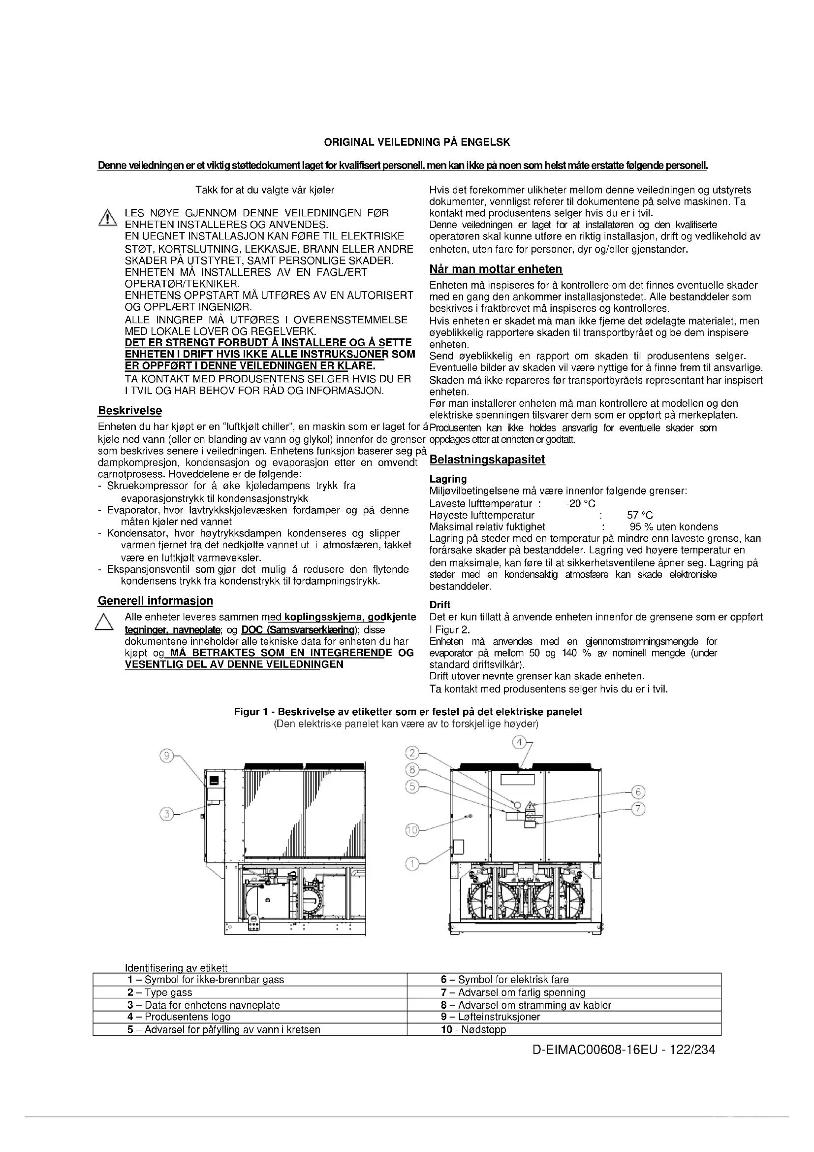 Hvis det forekommer ulikheter mellom denne veiledningen og utstyrets dokumenter, vennligst referer til dokumentene på selve maskinen. Ta kontakt med produsentens selger hvis du er i tvil. Denne veiledningen er laget for at installatøren og den kvalifiserte operatøren skal kunne utføre en riktig installasjon, drift og vedlikehold av enheten, uten fare for personer, dyr og/eller gjenstander. Når man mottar enheten Enheten må inspiseres for å kontrollere om det finnes eventuelle skader med en gang den ankommer installasjonstedet. Alle bestanddeler som beskrives i fraktbrevet må inspiseres og kontrolleres. Hvis enheten er skadet må man ikke fjerne det ødelagte materialet, men øyeblikkelig rapportere skaden til transportbyrået og be dem inspisere enheten. Send øyeblikkelig en rapport om skaden til produsentens selger. Eventuelle bilder av skaden vil være nyttige for å finne frem til ansvarlige. Skaden må ikke repareres før transportbyråets representant har inspisert enheten. Før man installerer enheten må man kontrollere at modellen og den elektriske spenningen tilsvarer dem som er oppført på merkeplaten. Produsenten kan ikke holdes ansvarlig for eventuelle skader som oppdages etter at enheten er godtatt. Belastningskapasitet Lagring Miljøvilbetingelsene må være innenfor følgende grenser: Laveste lufttemperatur : -20 °C Høyeste lufttemperatur : 57 °C Maksimal relativ fuktighet : 95 % uten kondens Lagring på steder med en temperatur på mindre enn laveste grense, kan forårsake skader på bestanddeler. Lagring ved høyere temperatur en den maksimale, kan føre til at sikkerhetsventilene åpner seg. Lagring på steder med en kondensaktig atmosfære kan skade elektroniske bestanddeler. Drift Det er kun tillatt å anvende enheten innenfor de grensene som er oppført I Figur 2. Enheten må anvendes med en gjennomstrømningsmengde for evaporator på mellom 50 og 140 % av nominell mengde (under standard driftsvilkår). Drift utover nevnte grenser kan skade enheten. Ta kontakt med produsentens selger hvis du er i tvil. Figur 1 - Beskrivelse av etiketter som er festet på det elektriske panelet (Den elektriske panelet kan være av to forskjellige høyder)