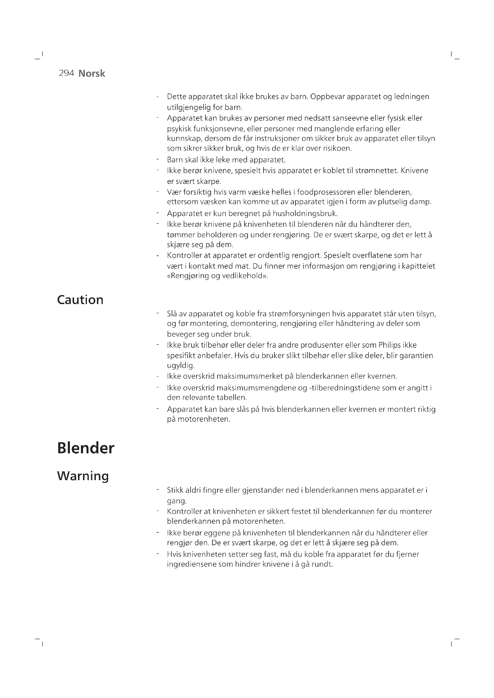 Hvis knivenheten setter seg fast, må du koble fra apparatet før du fjerner ingrediensene som hindrer knivene i å gå rundt.295 Norsk Caution