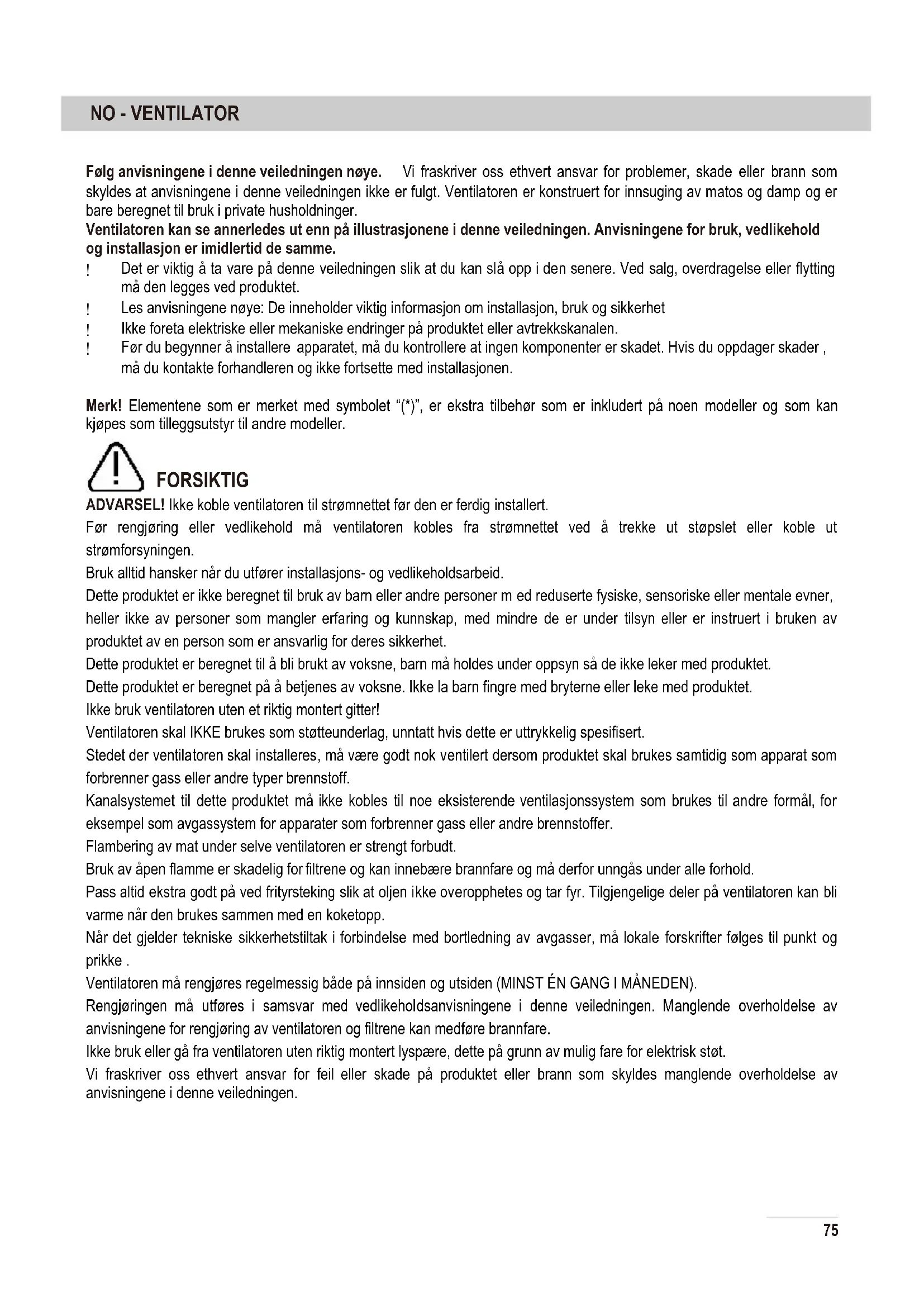 Før du begynner å installere apparatet, må du kontrollere at ingen komponenter er skadet. Hvis du oppdager skader , må du kontakte forhandleren og ikke fortsette med installasjonen. Merk! Elementene som er merket med symbolet “(*)”, er ekstra tilbehør som er inkludert på noen modeller og som kan kjøpes som tilleggsutstyr til andre modeller. FORSIKTIG ADVARSEL! Ikke koble ventilatoren til strømnettet før den er ferdig installert. Før rengjøring eller vedlikehold må ventilatoren kobles fra strømnettet ved å trekke ut støpslet eller koble ut strømforsyningen. Bruk alltid hansker når du utfører installasjons- og vedlikeholdsarbeid. Dette produktet er ikke beregnet til bruk av barn eller andre personer m ed reduserte fysiske, sensoriske eller mentale evner, heller ikke av personer som mangler erfaring og kunnskap, med mindre de er under tilsyn eller er instruert i bruken av produktet av en person som er ansvarlig for deres sikkerhet. Dette produktet er beregnet til å bli brukt av voksne, barn må holdes under oppsyn så de ikke leker med produktet. Dette produktet er beregnet på å betjenes av voksne. Ikke la barn fingre med bryterne eller leke med produktet. Ikke bruk ventilatoren uten et riktig montert gitter! Ventilatoren skal IKKE brukes som støtteunderlag, unntatt hvis d ette er uttrykkelig spesifisert. Stedet der ventilatoren skal installeres, må være godt nok ventilert dersom produktet skal brukes samtidig som apparat som forbrenner gass eller andre typer brennstoff. Kanalsystemet til dette produktet må ikke kobles til noe eksisterende ventilasjonssystem som brukes til andre formål, for eksempel som avgassystem for apparater som forbrenner gass eller andre brennstoffer. Flambering av mat under selve ventilatoren er strengt forbudt. Bruk av åpen flamme er skadelig for filtrene og kan innebære brannfare og må derfor unngås under alle forhold. Pass altid ekstra godt på ved frityrsteking slik at oljen ikke overopphetes og tar fyr. Tilgjengelige deler på ventilatoren kan bli varme når den brukes sammen med en koketopp. Når det gjelder tekniske sikkerhetstiltak i forbindelse med bortledning av avgasser, må lokale forskrifter følges til punkt og prikke . Ventilatoren må rengjøres regelmessig både på innsiden og utsiden (MINST ÉN GANG I MÅNEDEN). Rengjøringen må utføres i samsvar med vedlikeholdsanvisningene i denne veiledningen. Manglende overholdelse av anvisningene for rengjøring av ventilatoren og filtrene kan medføre brannfare. Ikke bruk eller gå fra ventilatoren uten riktig montert lyspære, dette på grunn av mulig fare for elektrisk støt. Vi fraskriver oss ethvert ansvar for feil eller skade på produktet eller brann som skyldes manglende overholdelse av anvisningene i denne veiledningen.