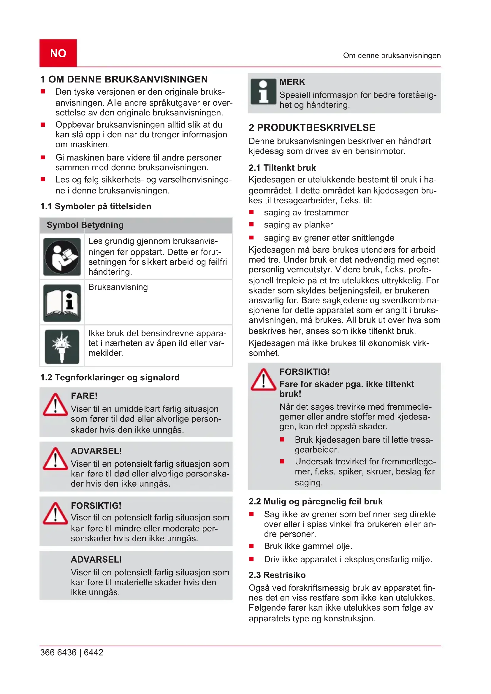 FARE! Viser til en umiddelbart farlig situasjon som fører til død eller alvorlige person- skader hvis den ikke unngås. ADVARSEL! Viser til en potensielt farlig situasjon som kan føre til død eller alvorlige personska- der hvis den ikke unngås. FORSIKTIG! Viser til en potensielt farlig situasjon som kan føre til mindre eller moderate per- sonskader hvis den ikke unngås. ADVARSEL! Viser til en potensielt farlig situasjon som kan føre til materielle skader hvis den ikke unngås. MERK Spesiell informasjon for bedre forståelig- het og håndtering. 2 PRODUKTBESKRIVELSE Denne bruksanvisningen beskriver en håndført kjedesag som drives av en bensinmotor.