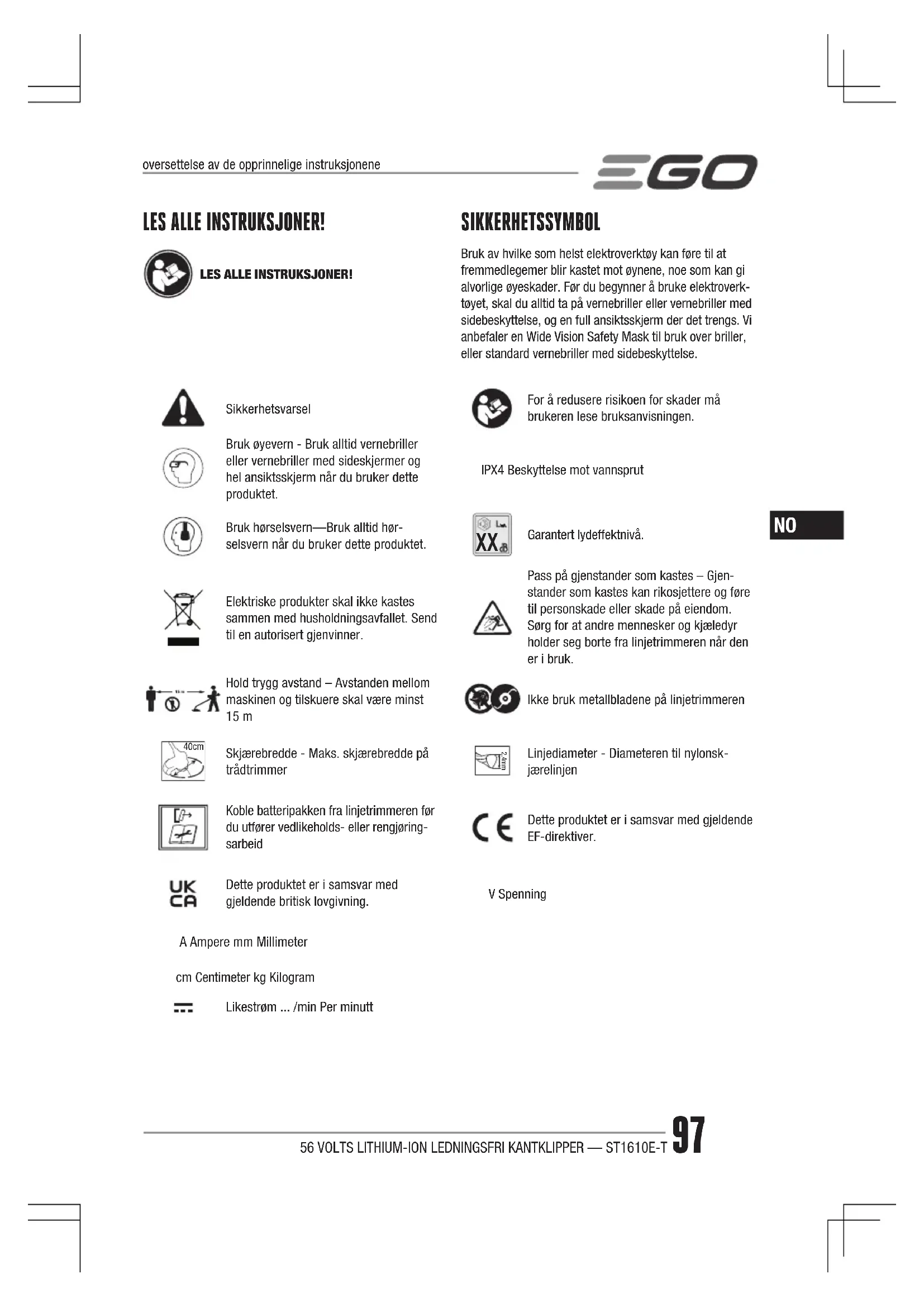 Garantert lydeffektnivå.Elektriske produkter skal ikke kastes sammen med husholdningsavfallet. Send til en autorisert gjenvinner.Pass på gjenstander som kastes – Gjen-stander som kastes kan rikosjettere og føre til personskade eller skade på eiendom. Sørg for at andre mennesker og kjæledyr holder seg borte fra linjetrimmeren når den er i bruk.Hold trygg avstand – Avstanden mellom maskinen og tilskuere skal være minst 15 m Ikke bruk metallbladene på linjetrimmeren 40cm Skjærebredde - Maks. skjærebredde på trådtrimmer 2.4mmLinjediameter - Diameteren til nylonsk-jærelinjenKoble batteripakken fra linjetrimmeren før du utfører vedlikeholds- eller rengjøring-sarbeidDette produktet er i samsvar med gjeldende EF-direktiver.Dette produktet er i samsvar med gjeldende britisk lovgivning.V SpenningA Ampere mm Millimetercm Centimeter kg KilogramLikestrøm ... /min Per minutt56 VOLTS LITHIUM-ION LEDNINGSFRI KANTKLIPPER — ST1610E-T98