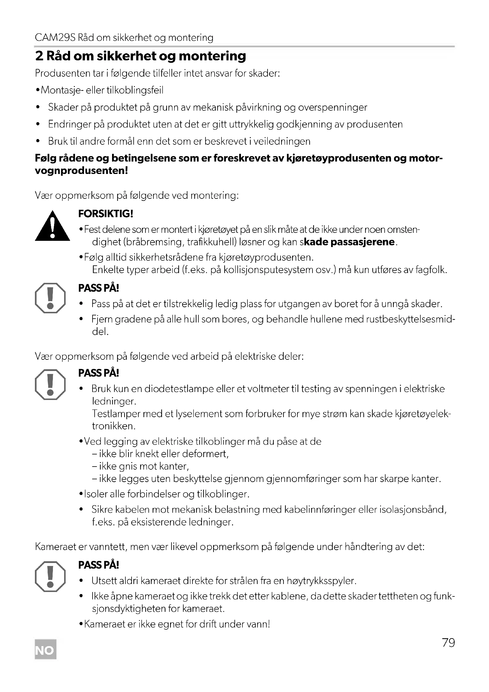 MERK Hvis du ikke har tilstrekkelig teknisk kunnskap om montering og tilkobling av kompo- nenter i kjøretøy, må du få fagfolk til å montere ryggevideokameraet i kjøretøyet. PASS PÅ! Før du borer noe som helst, må du forsikre deg om at ingen elektriske kabler eller andre deler på kjøretøyet kan skades av boring, saging og filing. MERK Vær oppmerksom på riktig posisjonering. Hvis kameraet ikke posisjoneres korrekt, kan bildet bli skjevt eller vises opp/ned på monitoren. PASS PÅ! Før du borer noe som helst, må du forsikre deg om at ingen elektriske kabler eller andre deler på kjøretøyet kan skades av boring, saging og filing. MERK