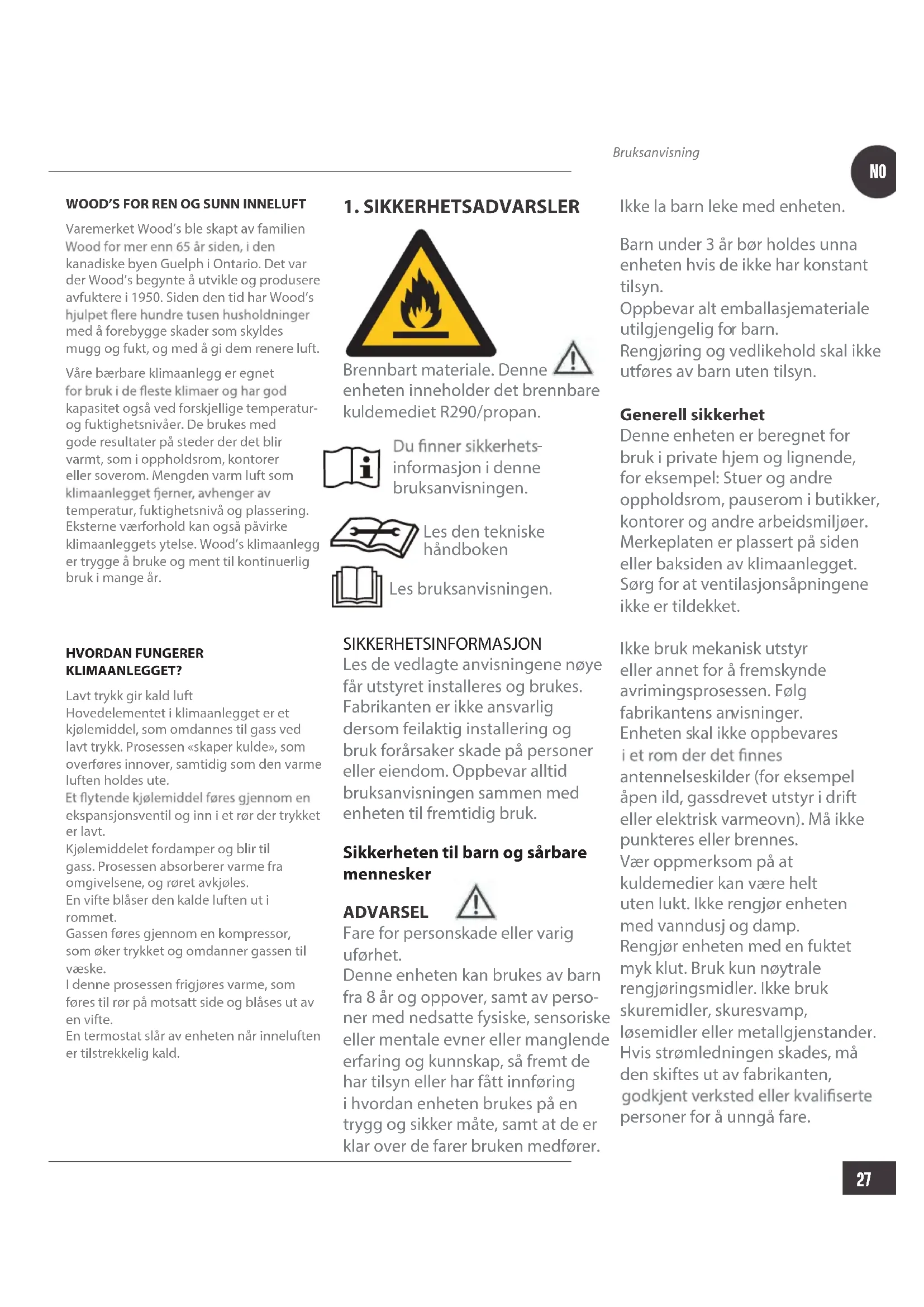 informasjon i denne bruksanvisningen. Les den tekniske håndboken Les bruksanvisningen. SIKKERHETSINFORMASJON Les de vedlagte anvisningene nøye får utstyret installeres og brukes. Fabrikanten er ikke ansvarlig dersom feilaktig installering og bruk forårsaker skade på personer eller eiendom. Oppbevar alltid bruksanvisningen sammen med enheten til fremtidig bruk. Sikkerheten til barn og sårbare mennesker ADVARSEL Fare for personskade eller varig uførhet. Denne enheten kan brukes av barn fra 8 år og oppover, samt av perso- ner med nedsatte fysiske, sensoriske eller mentale evner eller manglende erfaring og kunnskap, så fremt de har tilsyn eller har fått innføring i hvordan enheten brukes på en trygg og sikker måte, samt at de er klar over de farer bruken medfører. Ikke la b arn leke med enheten. Barn under 3 år bør holdes unna enheten hvis de ikke har konstant tilsyn. Oppbevar alt emballasjemateriale utilgjengelig fo r barn. Rengjøring og vedlikehold skal ikke utføres av barn uten tilsyn. Generell sikkerhet Denne enheten er beregnet for bruk i private hjem og lignende, for eksempel: Stuer og andre oppholdsrom, pauserom i butikker, kontorer og andre arbeidsmiljøer. Merkeplaten er plassert på siden eller baksiden av klimaanlegget. Sørg for at ventilasjonsåpningene ikke er tildekket. Ikke bruk mekanisk utstyr eller annet for å fremskynde avrimingsprosessen. Følg fabrikantens an visninger. Enheten