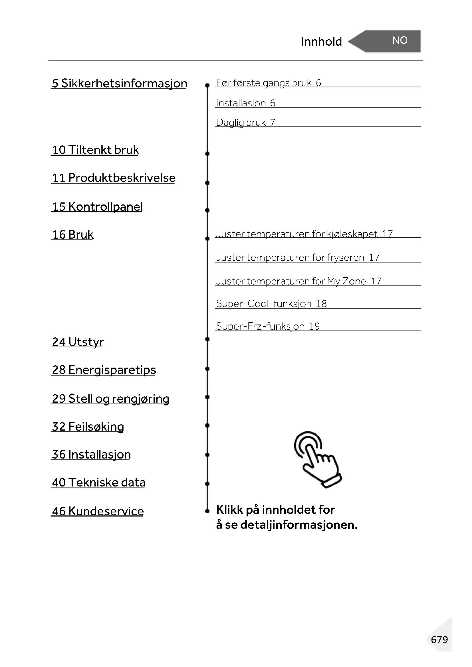 Før første gangs bruk 6 Installasjon 6 Daglig bruk 7 10 Tiltenkt bruk 11 Produktbeskrivelse 15 Kontrollpanel 16 Bruk Juster temperaturen for kjøleskapet 17 Juster temperaturen for fryseren 17 Juster temperaturen for My Zone 17 Super-Cool-funksjon 18 Super-Frz-funksjon 19 24 Utstyr 28 Energisparetips 29 Stell og rengjøring 32 Feilsøking 36 Installasjon 40 Tekniske data 46 Kundeservice Klikk på innholdet for å se detaljinformasjonen. 679Takk skal du ha