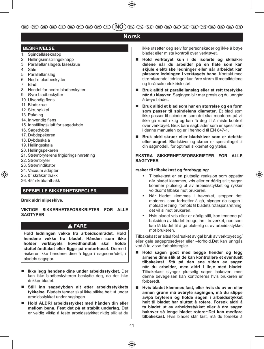 EN FR DE ES IT NL PT DA SV FI NO RU PL CS HU RO LV LT ET HR SL SK EL TR Norsk inntil spindelen låses. 3. Stram til bolten med sekskanthode ved å dreie fastnøkkelen mot venstre. 4. Ta ut bladskruen og den ytre bladskiven. 5. Løft den nedre bladbeskytteren helt opp ved hjelp av hendelen under den øvre bladbeskytteren. 6. Fest sagbladet mot den indre pakningen på spindelen. 7. Fest den utvendige pakningen og bolten med sekskanthode. 8. Stram til bolten med sekskanthode ved å dreie fastnøkkelen mot høyre. 9. Når bladskruen er strammet til, slipp spindellåseknappen. NB: Når bladet er installert, må du kontrollere at spindellåsen har vært utgitt av spinner bladet fritt.