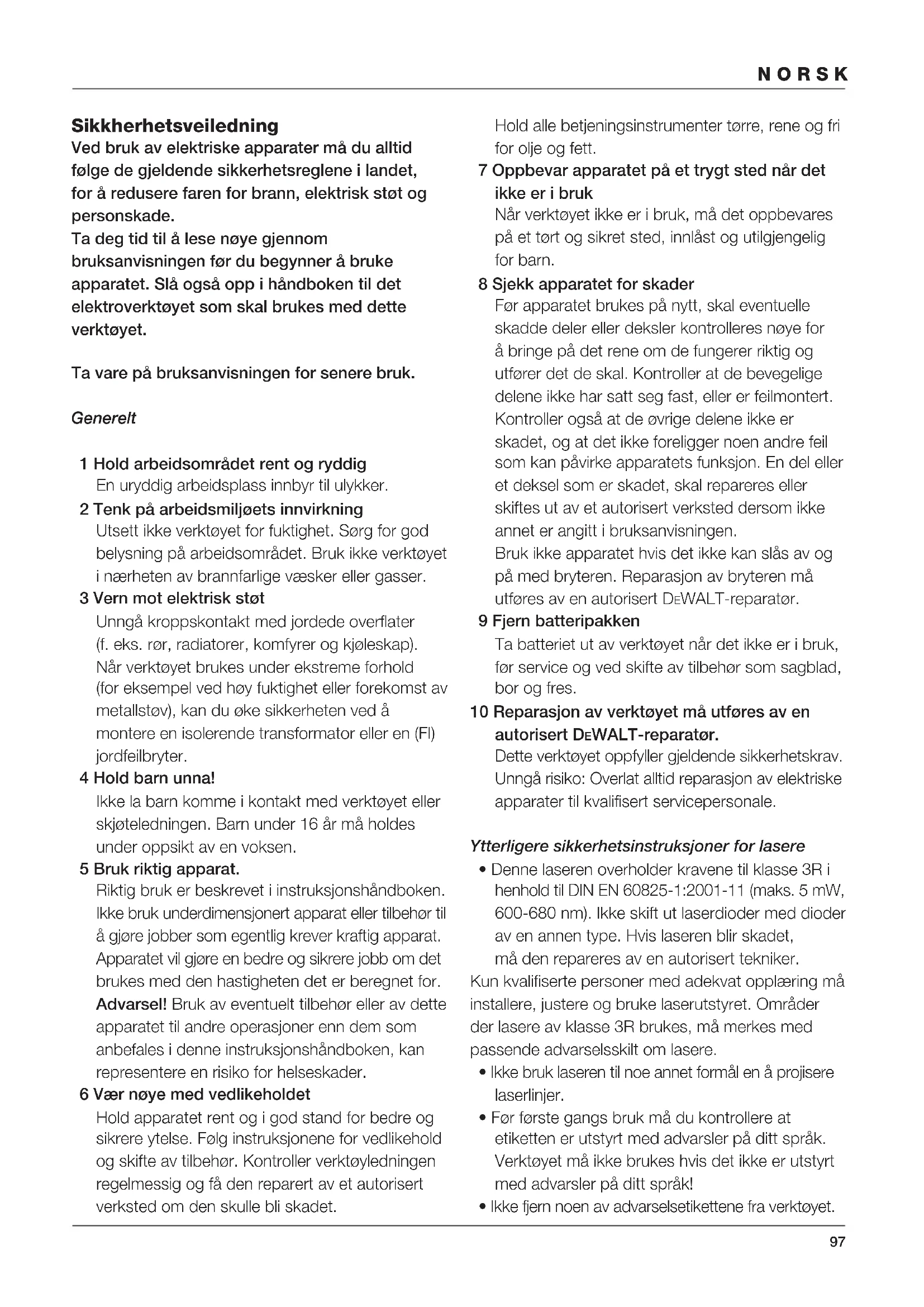 - ved brukerens øre Director Engineering and Product Development Horst Großmann DEWALT, Richard-Klinger-Straße 11, D-65510, Idstein, Tyskland97 NORSK Sikkherhetsveiledning Ved bruk av elektriske apparater må du alltid følge de gjeldende sikkerhetsreglene i landet, for å redusere faren for brann, elektrisk støt og personskade. Ta deg tid til å lese nøye gjennom bruksanvisningen før du begynner å bruke apparatet. Slå også opp i håndboken til det elektroverktøyet som skal brukes med dette verktøyet. Ta vare på bruksanvisningen for senere bruk. Generelt 1 Hold arbeidsområdet rent og ryddig En uryddig arbeidsplass innbyr til ulykker. 2 Tenk på arbeidsmiljøets innvirkning Utsett ikke verktøyet for fuktighet. Sørg for god belysning på arbeidsområdet. Bruk ikke verktøyet i nærheten av brannfarlige væsker eller gasser. 3 Vern mot elektrisk støt Unngå kroppskontakt med jordede overflater (f. eks. rør, radiatorer, komfyrer og kjøleskap). Når verktøyet brukes under ekstreme forhold (for eksempel ved høy fuktighet eller forekomst av metallstøv), kan du øke sikkerheten ved å montere en isolerende transformator eller en (FI) jordfeilbryter. 4 Hold barn unna! Ikke la barn komme i kontakt med verktøyet eller skjøteledningen. Barn under 16 år må holdes under oppsikt av en voksen. 5 Bruk riktig apparat. Riktig bruk er beskrevet i instruksjonshåndboken. Ikke bruk underdimensjonert apparat eller tilbehør til å gjøre jobber som egentlig krever kraftig apparat. Apparatet vil gjøre en bedre og sikrere jobb om det brukes med den hastigheten det er beregnet for. Advarsel! Bruk av eventuelt tilbehør eller av dette apparatet til andre operasjoner enn dem som anbefales i denne instruksjonshåndboken, kan representere en risiko for helseskader. 6 Vær nøye med vedlikeholdet Hold apparatet rent og i god stand for bedre og sikrere ytelse. Følg instruksjonene for vedlikehold og skifte av tilbehør. Kontroller verktøyledningen regelmessig og få den reparert av et autorisert verksted om den skulle bli skadet. Hold alle betjeningsinstrumenter tørre, rene og fri for olje og fett. 7 Oppbevar apparatet på et trygt sted når det ikke er i bruk Når verktøyet ikke er i bruk, må det oppbevares på et tørt og sikret sted, innlåst og utilgjengelig for barn. 8 Sjekk apparatet for skader Før apparatet brukes på nytt, skal eventuelle skadde deler eller deksler kontrolleres nøye for å bringe på det rene om de fungerer riktig og utfører det de skal. Kontroller at de bevegelige delene ikke har satt seg fast, eller er feilmontert. Kontroller også at de øvrige delene ikke er skadet, og at det ikke foreligger noen andre feil som kan påvirke apparatets funksjon. En del eller et deksel som er skadet, skal repareres eller skiftes ut av et autorisert verksted dersom ikke annet er angitt i bruksanvisningen. Bruk ikke apparatet hvis det ikke kan slås av og på med bryteren. Reparasjon av bryteren må utføres av en autorisert DEWALT-reparatør. 9 Fjern batteripakken Ta batteriet ut av verktøyet når det ikke er i bruk, før service og ved skifte av tilbehør som sagblad, bor og fres. 10 Reparasjon av verktøyet må utføres av en autorisert DEWALT-reparatør. Dette verktøyet oppfyller gjeldende sikkerhetskrav. Unngå risiko: Overlat alltid reparasjon av elektriske apparater til kvalifisert servicepersonale. Ytterligere sikkerhetsinstruksjoner for lasere