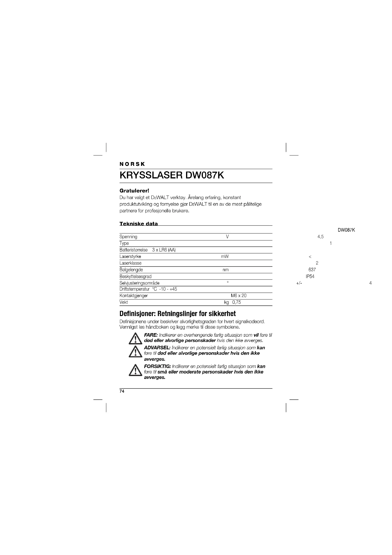 Gratulerer! Du har valgt et DEWALT verktøy. Årelang erfaring, konstant produktutvikling og fornyelse gjør DEWALT til en av de mest pålitelige partnere for profesjonelle brukere. Tekniske data DW087K Spenning V 4,5 Type 1 Batteristørrelse 3 x LR6 (AA) Laserstyrke mW < 1,3 Laserklasse 2 Bølgelengde nm 637 Beskyttelsesgrad IP54 Selvjusteringsområde ° +/- 4 Driftstemperatur °C -10 - +45 Kontaktgjenger M6 x 20 Vekt kg 0,75 Defi nisjoner: Retningslinjer for sikkerhet Definisjonene under beskriver alvorlighetsgraden for hvert signalkodeord. Vennligst les håndboken og legg merke til disse symbolene. FARE: Indikerer en overhengende farlig situasjon som vil føre til død eller alvorlige personskader hvis den ikke avverges. ADVARSEL: Indikerer en potensielt farlig situasjon som kan føre til død eller alvorlige personskader hvis den ikke avverges. FORSIKTIG: Indikerer en potensielt farlig situasjon som kan føre til små eller moderate personskader hvis den ikke avverges. NORSK75 NORSK MERK: Angir en arbeidsmåte som ikke er relatert til personskader, men som kan føre til skader på utstyr hvis den ikke unngås. Betegner fare for elektrosjokk. Betegner fare for brann. Sikkerhetsinstruksjoner for lasere ADVARSEL! Les og forstå alle instruksjoner. Manglende overholdelse av instruksjonene som er listet opp under kan resultere i elektrosjokk, ild og/eller alvorlig personskade.
