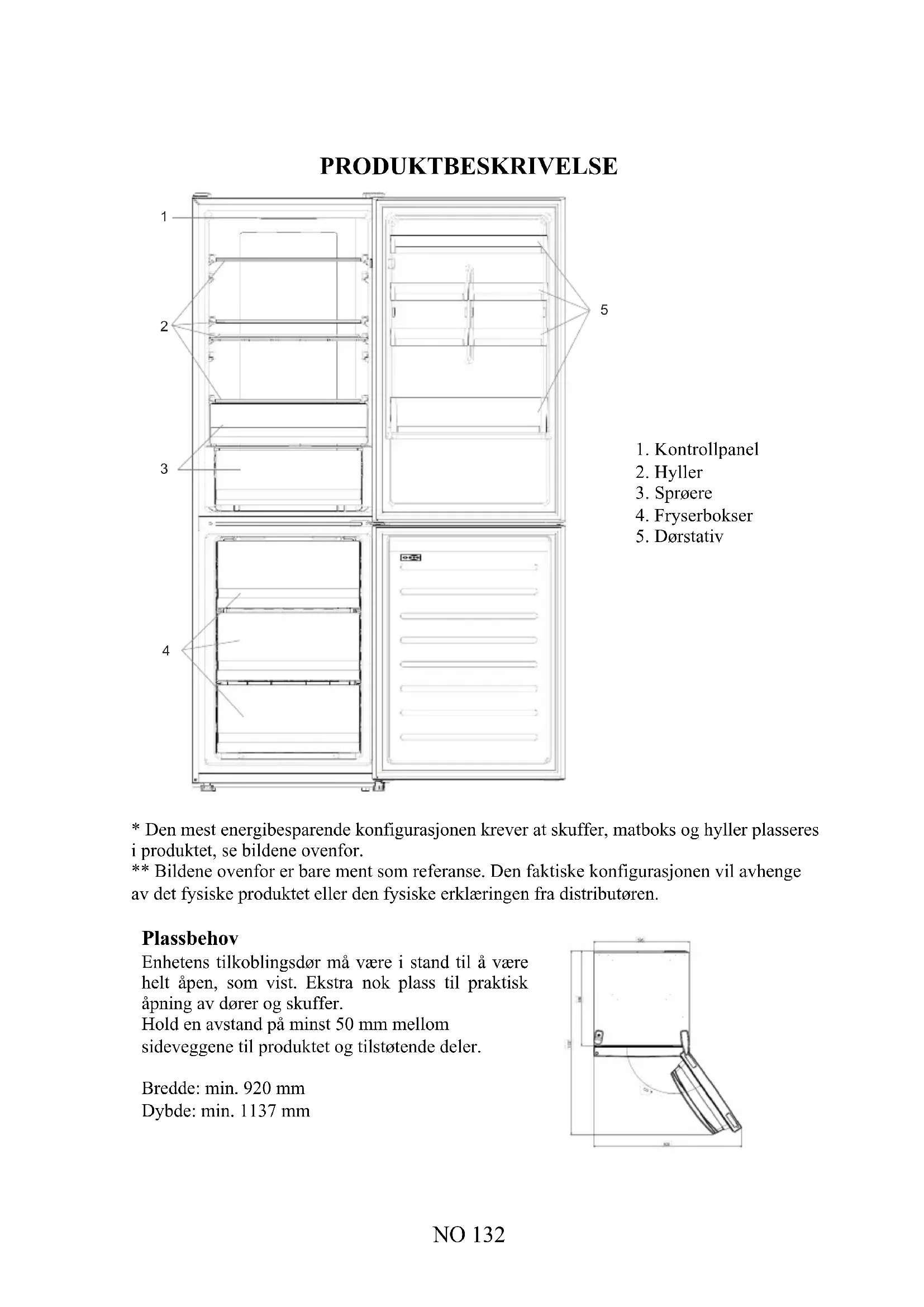 - Den mest energibesparende konfigurasjonen krever at skuffer, matboks og hyller plasseres i produktet, se bildene ovenfor. ** Bildene ovenfor er bare ment som referanse. Den faktiske konfigurasjonen vil avhenge av det fysiske produktet eller den fysiske erklæringen fra distributøren. Plassbehov Enhetens tilkoblingsdør må være i stand til å være helt åpen, som vist. Ekstra nok plass til praktisk åpning av dører og skuffer. Hold en avstand på minst 50 mm mellom sideveggene til produktet og tilstøtende deler. Bredde: min. 920 mm Dybde: min. 1137 mm